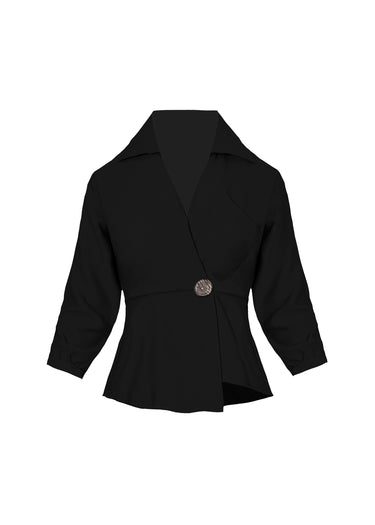 Esta Blusa tipo blazer en color negro profundo es una pieza de sastrería híbrida que combina la estructura formal con un diseño de inspiración peplum muy femenino. La prenda presenta un elegante cuello de solapa en punta y un cuerpo cruzado que se cierra en la cintura mediante un único botón de gran tamaño con efecto carey, el cual actúa como punto focal de la pieza.