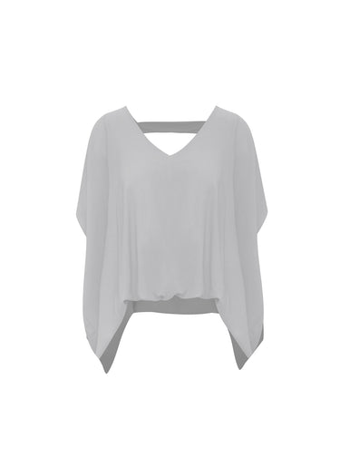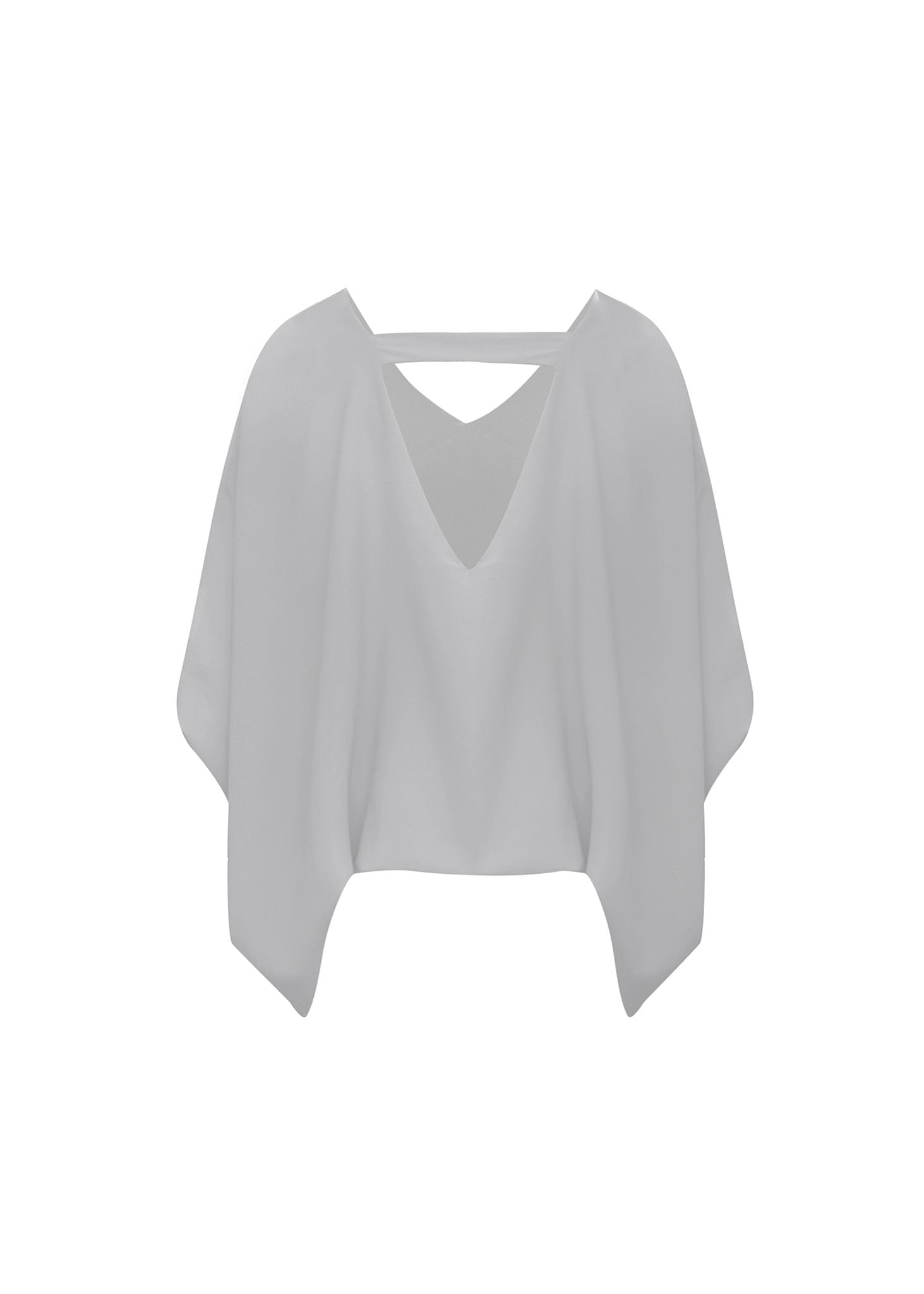 sta blusa es una pieza de diseño conceptual que redefine la fluidez mediante una estructura de volumen envolvente y acabados técnicos de alta costura. Confeccionada en un satín de tacto ultra suave, la prenda destaca por sus mangas sisa de corte extra ancho y extendido, que fluyen desde el hombro creando una caída dramática y elegante. El diseño incorpora un escote en V en ambos frentes, manteniendo una profundidad equilibrada que aporta simetría y sofisticación. El elemento arquitectónico central es su sistema de recogido inferior, donde un resorte técnico queda completamente oculto bajo un excedente de tela, generando un efecto abullonado u "overhang" que aporta dimensión al torso sin interrumpir la continuidad visual del tejido. Esta estructura se complementa con un bajo asimétrico, diseñado para ser significativamente más largo en los laterales que en el centro, lo que permite un movimiento orgánico y una silueta dinámica que se adapta con gracia a la figura en cada paso.
