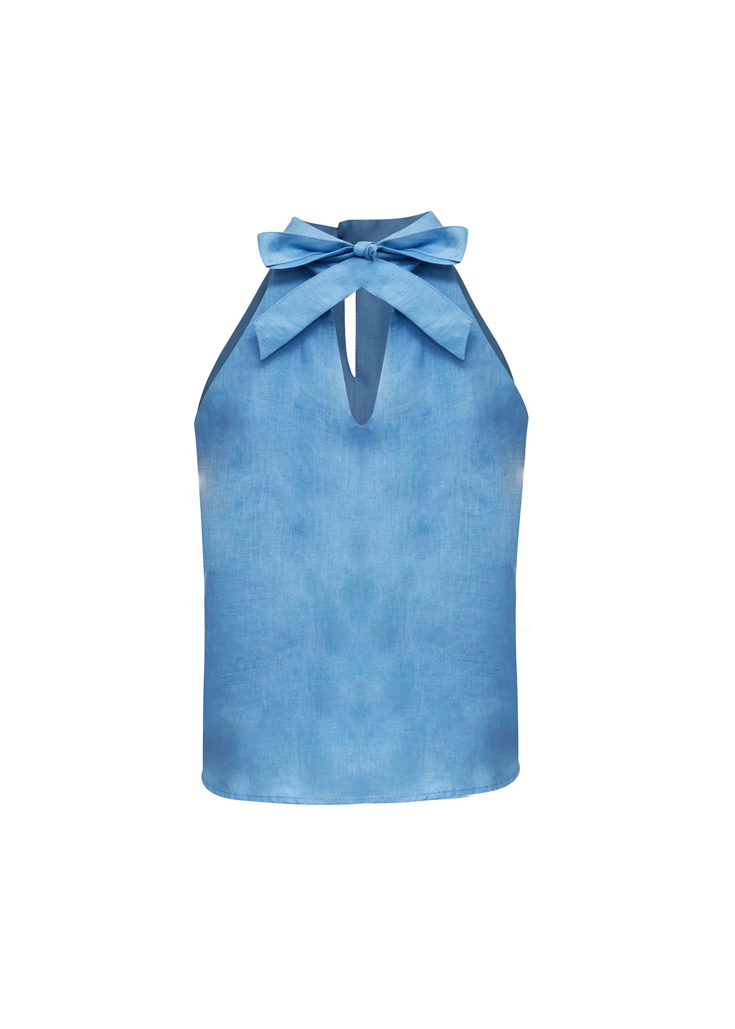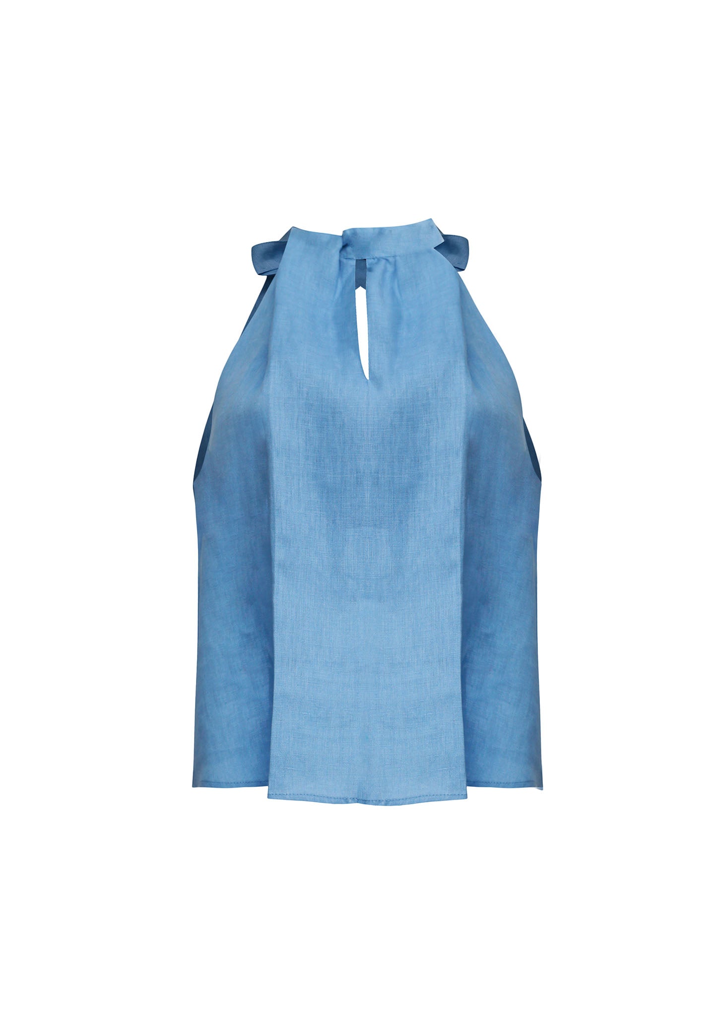 Esta pieza captura la esencia de la elegancia veraniega con su impecable corte halter, una silueta que enmarca los hombros con distinción. En una refrescante tonalidad azul celeste, irradia una estética resort y ligera. Su diseño flou y la caída fluida otorgan un movimiento natural y una sensación de frescura. El detalle del lazo self-tie en el cuello mock añade un punto focal coqueto, mientras que la abertura en forma de ojal en la espalda asegura un acabado limpio y pulido. Ideal para inyectar un color vibrante en cualquier look de día o de noche.