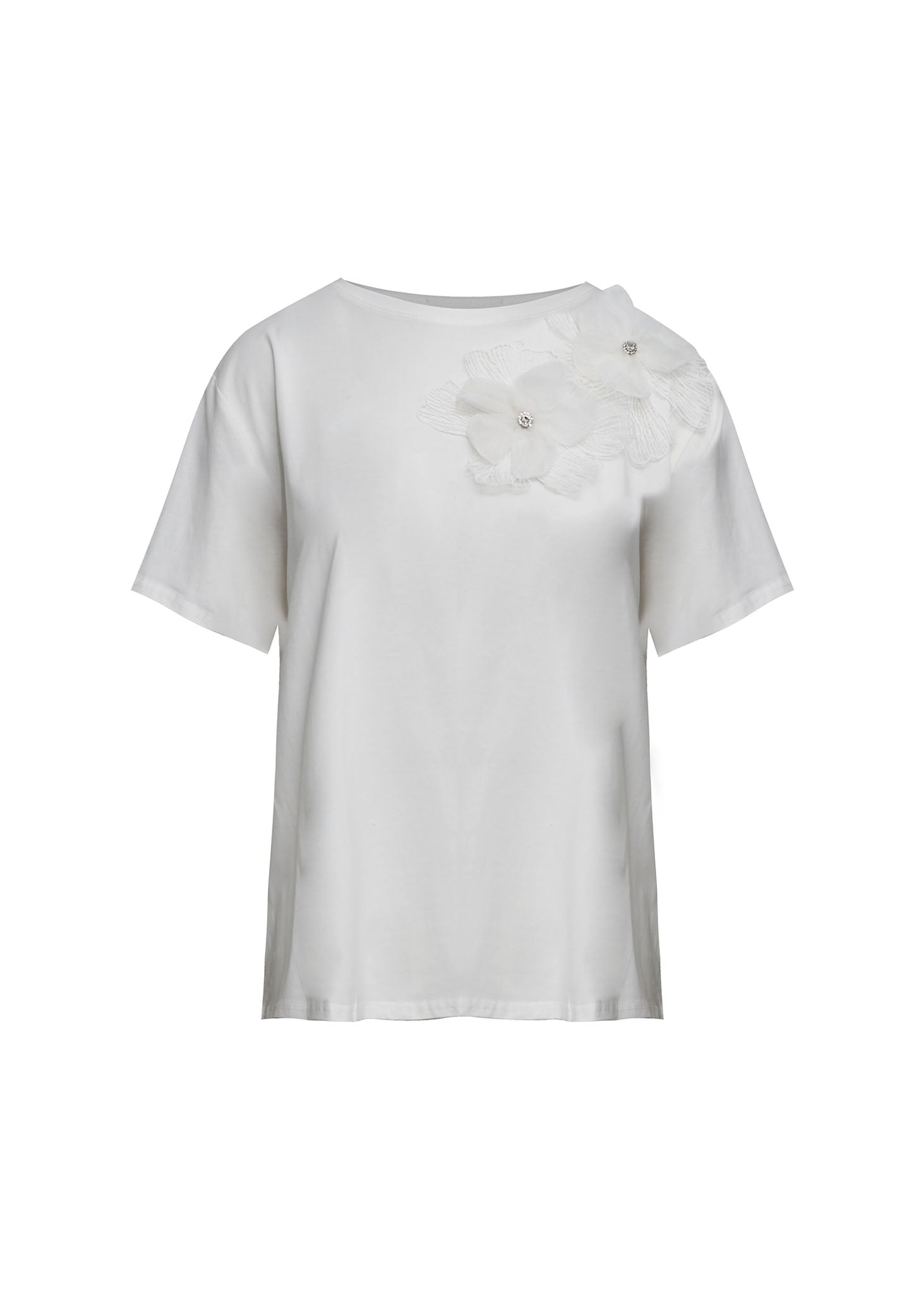 Esta blusa blanca de silueta fluida es una prenda que combina la sencillez de una camiseta básica con el refinamiento de los detalles tridimensionales. La pieza destaca por su aplicación de flores artesanales en el hombro izquierdo, confeccionadas en un delicado tejido traslúcido con texturas plisadas que aportan volumen y un aire romántico. Cada flor está rematada en su centro con un pequeño cristal brillante, añadiendo un toque de luz discreto y sofisticado. Con un cuello redondo clásico y mangas cortas de corte limpio, esta blusa es la opción ideal para elevar un conjunto diario o para complementar un estilismo de evento formal con una nota de feminidad moderna.