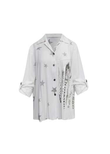 Esta camisa es la definición de un estilo relajado con mucha personalidad. Destaca por su estampado de estrellas repartido por toda la prenda y un audaz gráfico lateral en acabado metalizado que le da un aire artístico y moderno. Su corte holgado la convierte en la opción ideal para quienes buscan comodidad sin renunciar a las últimas tendencias del diseño urbano.