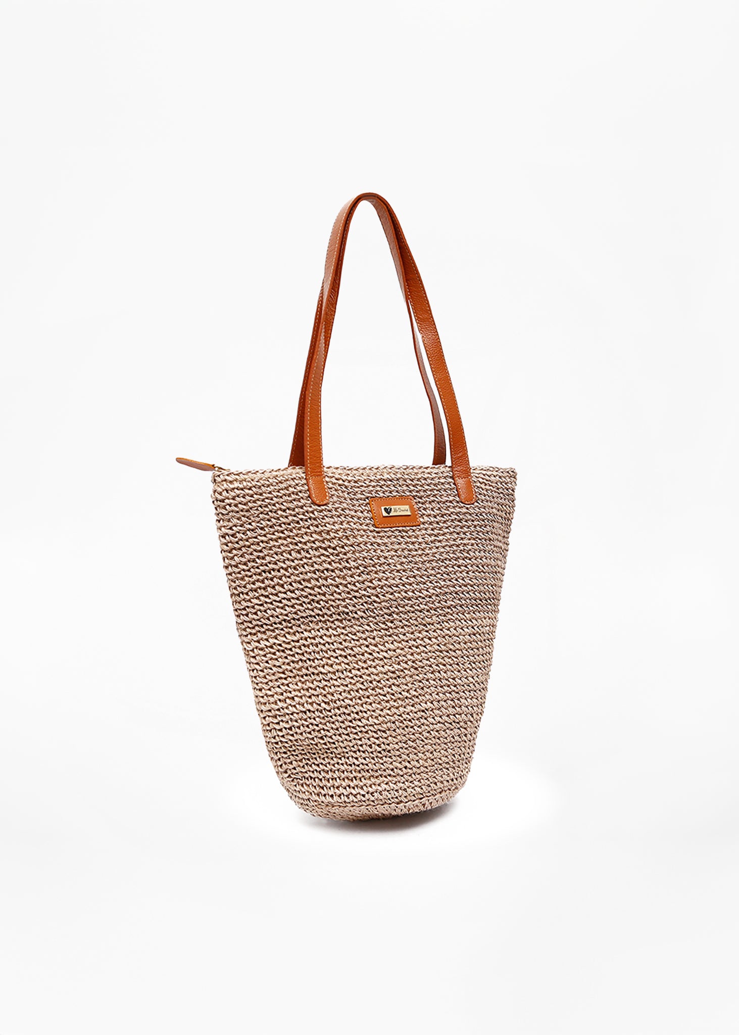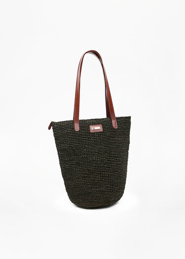 Bolso tejido en tono terracota, verde, beige con forma alargada y estructura firme. Cuenta con asas largas de cuero sintético marrón, ideales para llevar al hombro. Incorpora un cierre superior y una placa metálica decorativa al frente. Su estilo artesanal combina elegancia y funcionalidad para el uso diario.