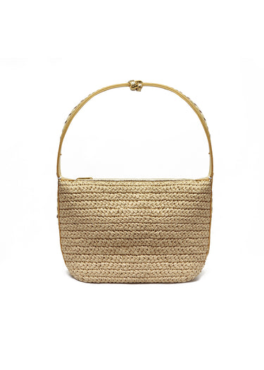 Bolso de paja con un diseño de tejido trenzado y un asa circular de bambú. Perfecto para un look de verano.