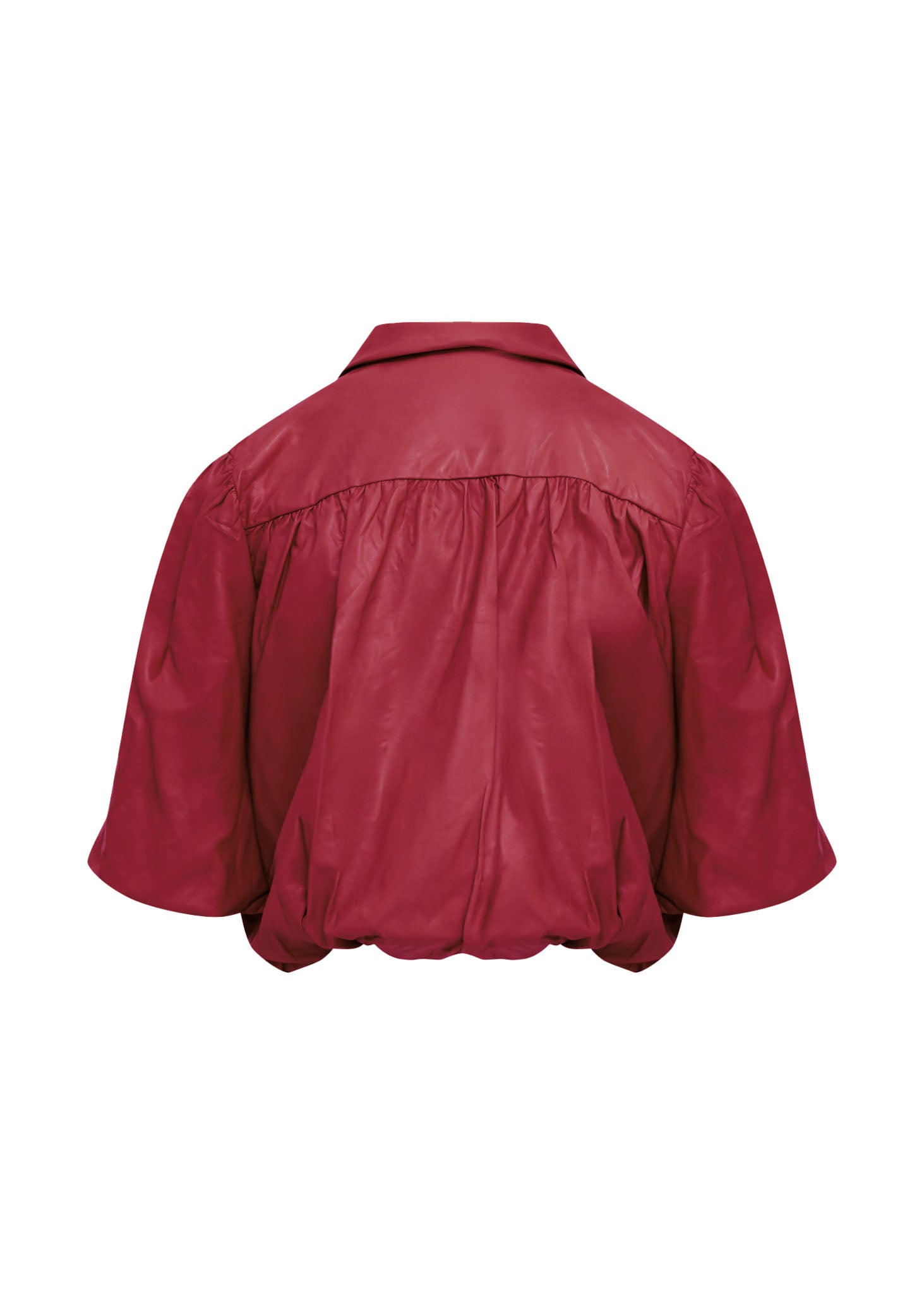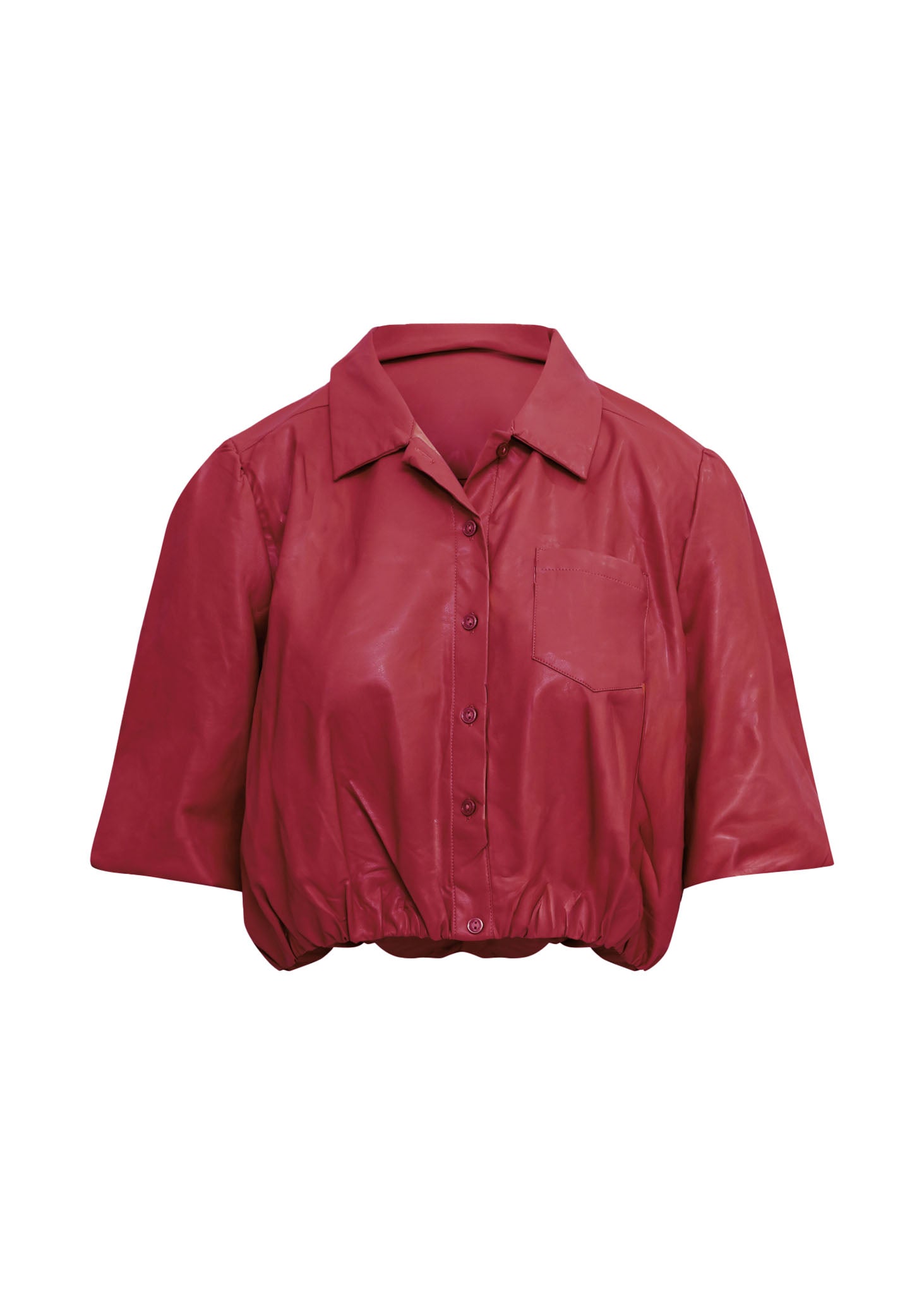 Añade una explosión de color y textura a tu guardarropa con nuestra Camisa Crop de Efecto Piel en un vibrante tono rojo cereza. El tejido suave de polipiel, combinado con el corte crop y el moderno bajo elástico fruncido, transforma una prenda clásica en una pieza statement. Úsala abotonada como blusa o abierta como una chaqueta ligera.