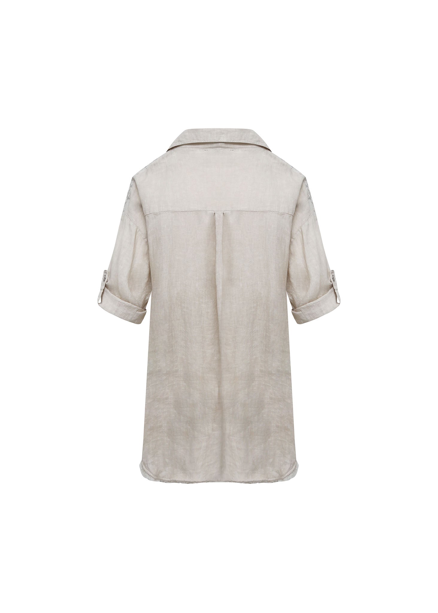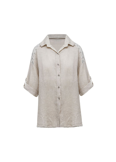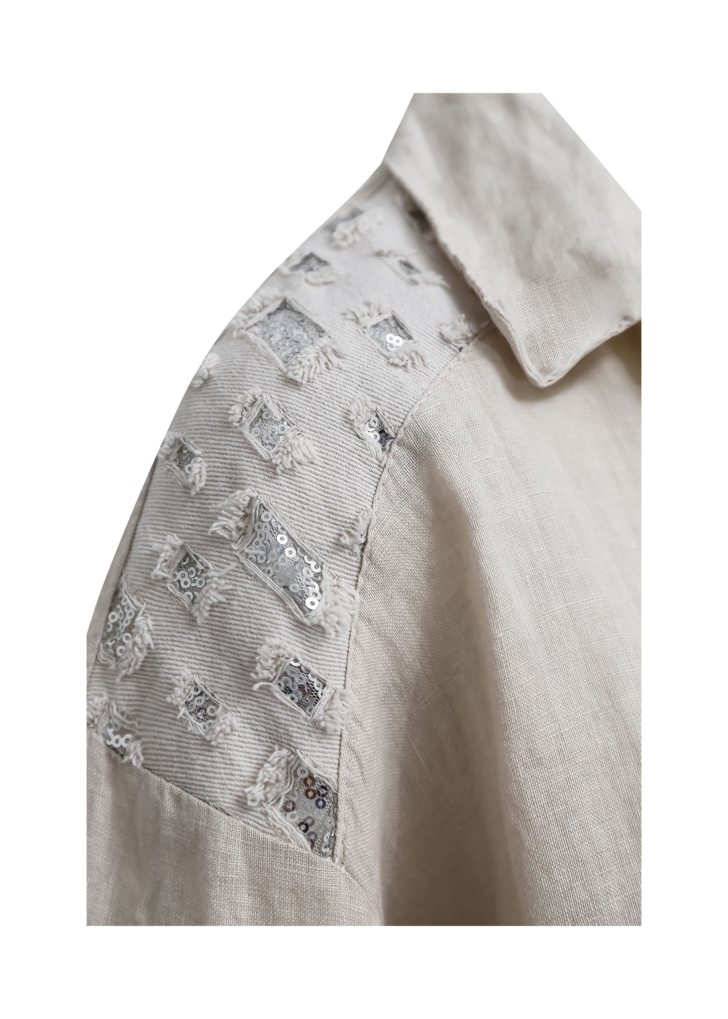 La pieza destaca por el detalle de aplicaciones bordadas en tono plata/gris claro que adornan sutilmente la parte superior de los hombros, inyectando un toque de brillo y sofisticación al tejido natural. Presenta un cierre frontal abotonado con botones a tono y un acabado ligeramente desflecado en el bajo.