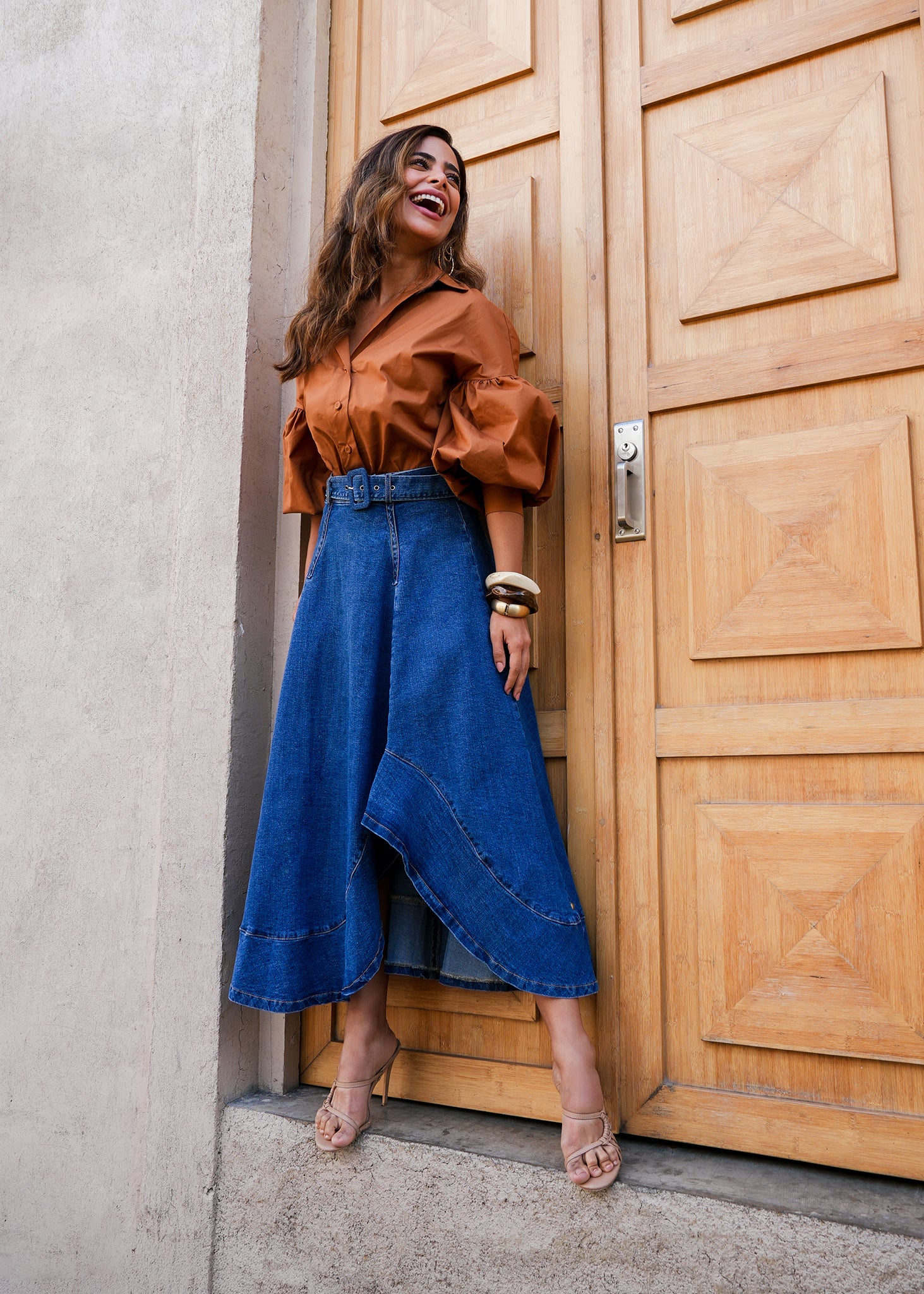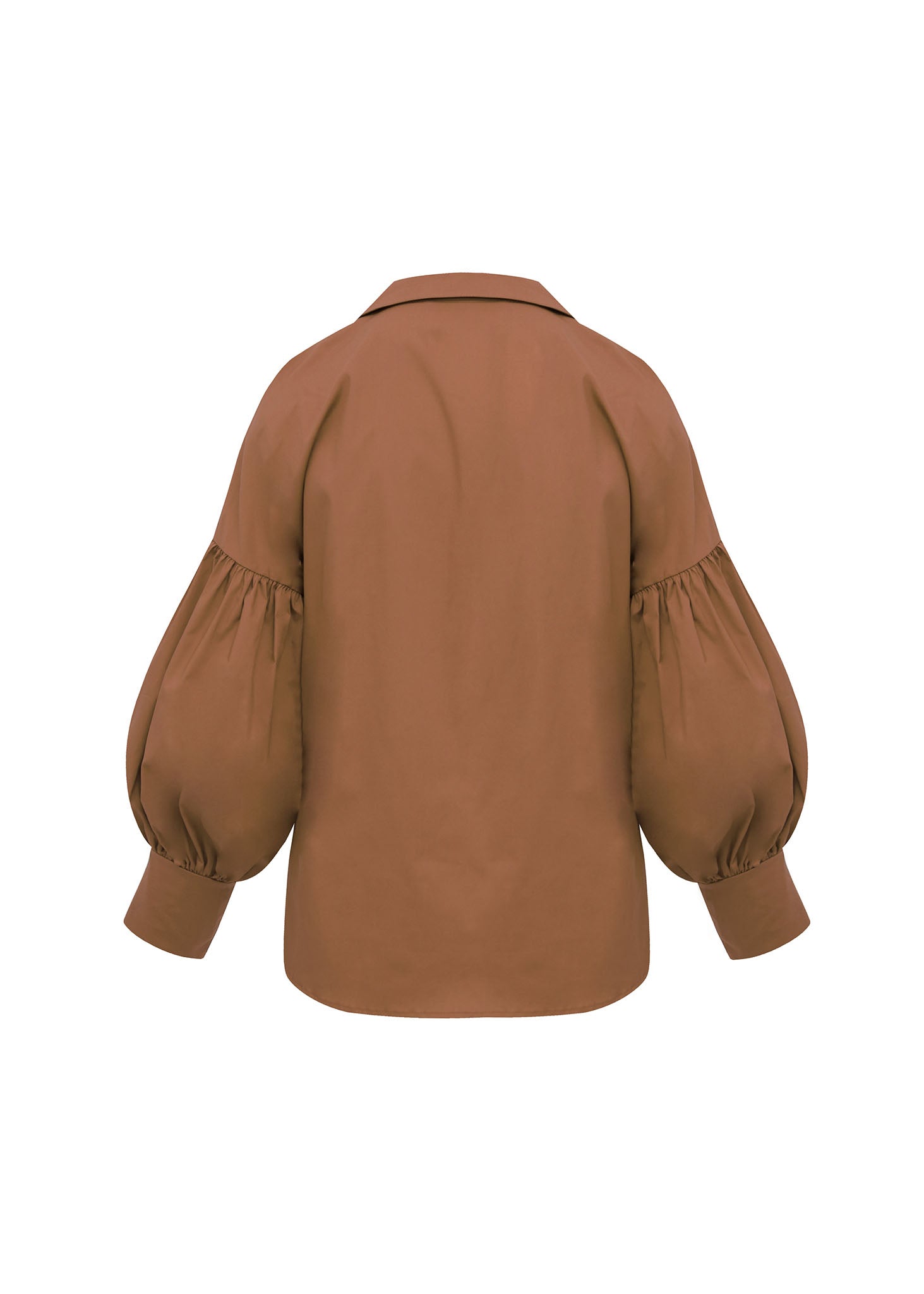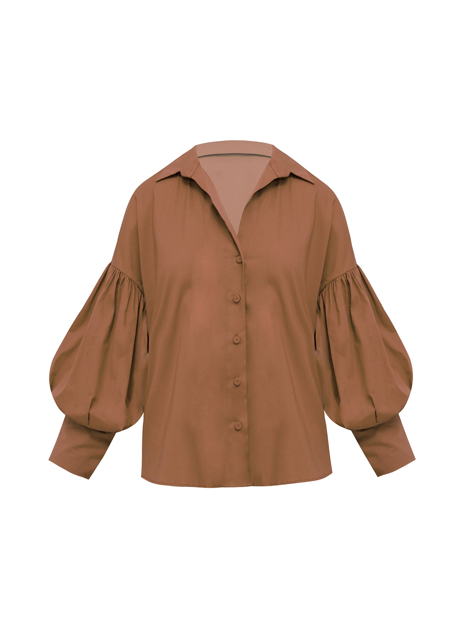 Esta camisa de silueta romántica en color teja destaca por su diseño equilibrado entre la sastrería clásica y el volumen dramático. La prenda está confeccionada en un tejido fluido que resalta la profundidad de su tono tierra, presentando un cuello de solapa abierto y una fila de botones frontales a tono que mantienen una estética limpia y sofisticada. El elemento más distintivo son sus mangas abullonadas de estilo poeta, que nacen de un hombro caído y se recogen en puños anchos y estructurados, creando un juego de volúmenes que aporta carácter y elegancia a cualquier conjunto. Es una pieza versátil y atemporal, ideal tanto para un look de oficina refinado como para una ocasión casual con un toque de distinción.