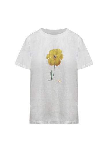 Esta es una camiseta de corte relajado, confeccionada en lino natural y fresco en un blanco óptico que subraya su calidad premium. La pieza se eleva con un estampado statement de una única flor amarilla en el frente. Este diseño minimalista pero audaz inyecta un toque de color solar y un aire bohemian-chic a la pureza del lino.