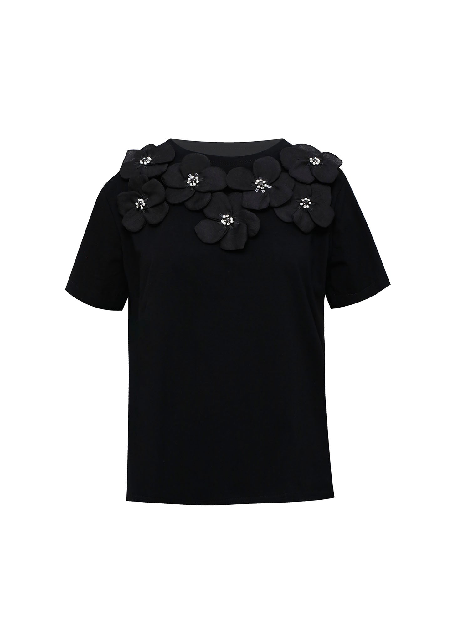 La camiseta de corte recto y relajado sirve como lienzo para un adorno romántico y vanguardista . El cuello y los hombros están adornados con una serie de apliques de flores 3D en fieltro o tela negra, creando un efecto escultural y textural único. Cada flor central está acentuada con detalles de cuentas blancas o pedrería que añaden un toque de brillo sutil y contraste chic .