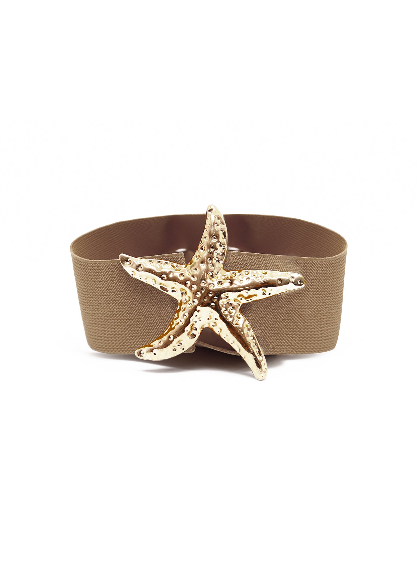 Define tu silueta con un toque marino. Este cinturón elástico en color mostaza se ajusta cómodamente, mientras que su hebilla de estrella de mar dorada añade un detalle original y llamativo. Ideal para complementar vestidos o túnicas, es el accesorio perfecto para un look veraniego y fresco.