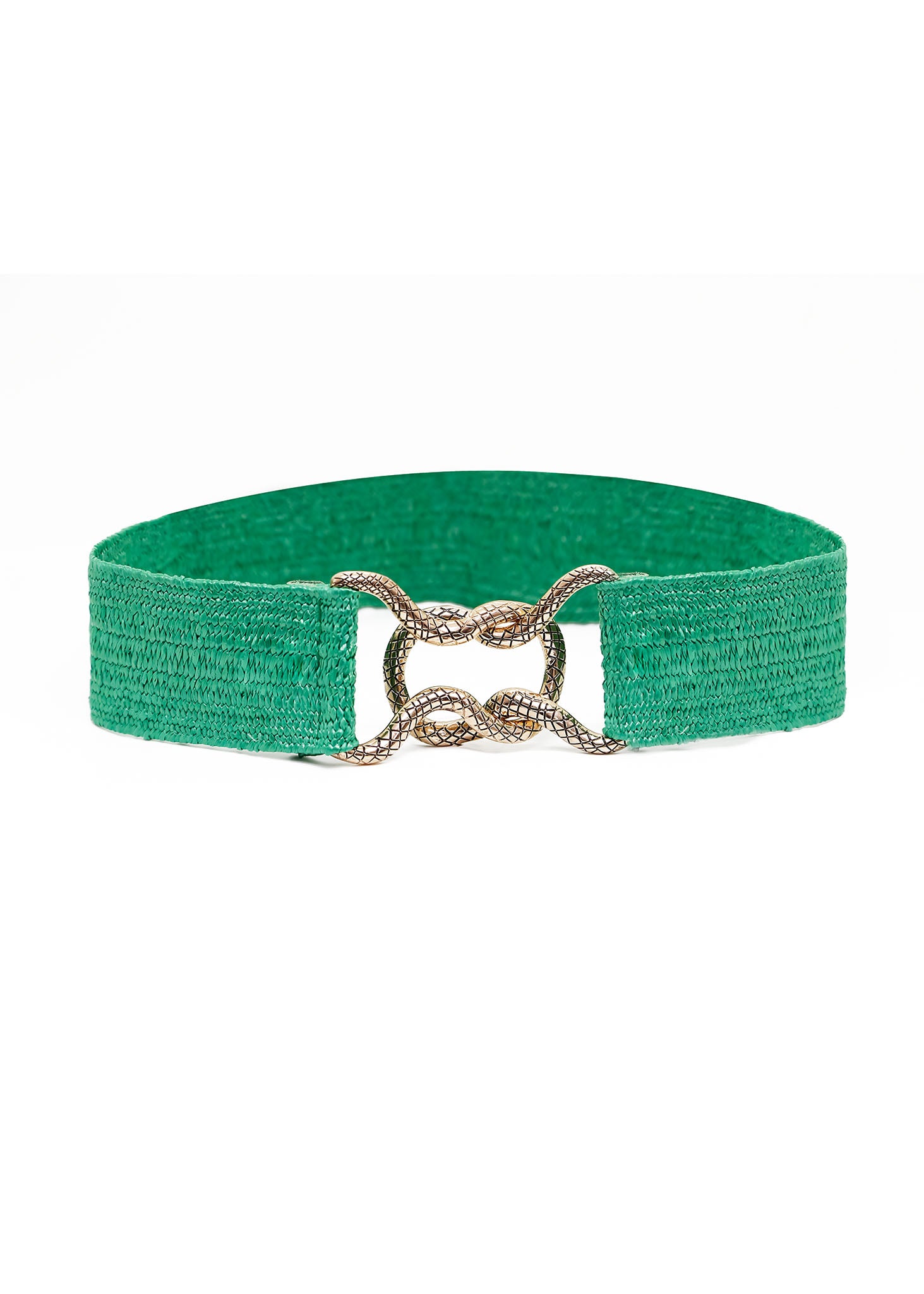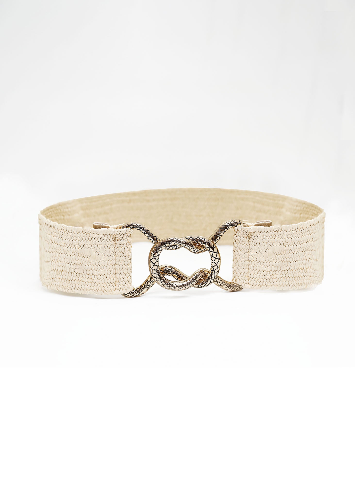 Un accesorio que fusiona la textura orgánica con un diseño audaz y atrevido. Este cinturón ancho de rafia tejida es el lienzo perfecto para su característica principal: la hebilla de serpientes entrelazadas. Esta pieza metálica con acabado bronce envejecido o pátina añade un toque de misterio y lujo vintage, asegurando que el cinturón se convierta en el centro de atención. Es ideal para definir la silueta sobre vestidos de seda, faldas lápiz o camisas largas.