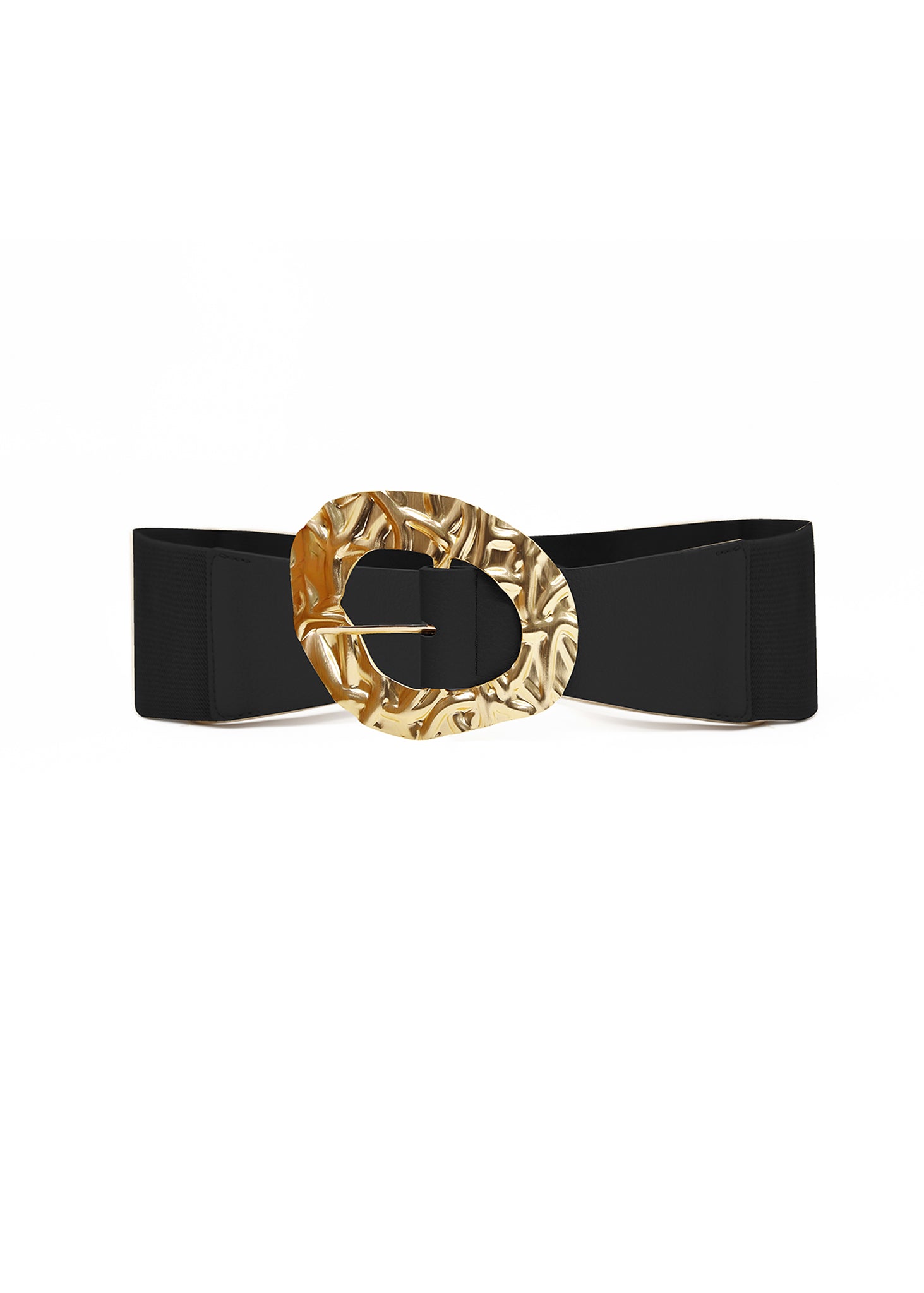 Cinturón ancho elástico con una llamativa hebilla dorada con textura martillada. Un accesorio perfecto para definir tu cintura y añadir un toque audaz a tu look.