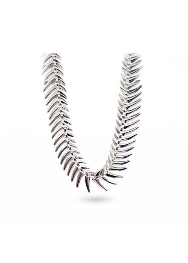 Collar de diseño único con eslabones metálicos en forma de espina de pescado. Su acabado brillante y plateado añade un toque moderno y audaz, perfecto para un look llamativo.