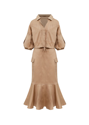 Este es un conjunto coordinado de dos piezas confeccionado en un sofisticado tono café profundo (mocha o tierra). La blusa de manga larga presenta un diseño utilitario con bolsillos de parche en el frente, aportando un aire safari-chic. La falda complementa el look con bolsillos laterales funcionales y un corte depurado. Esta combinación es la definición de la elegancia monocromática y effortless, perfecta para un estilismo cohesivo y de tendencia.