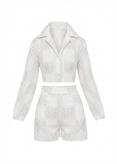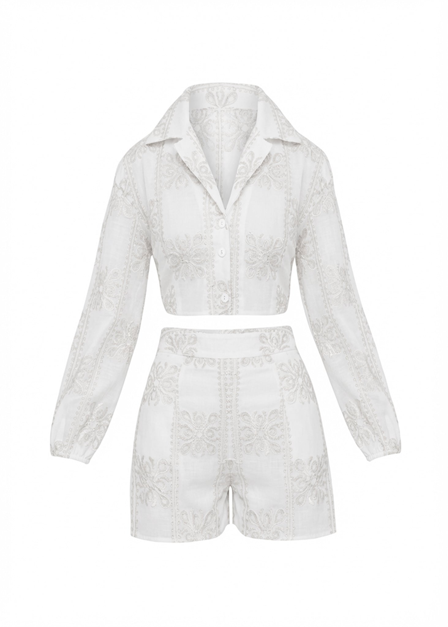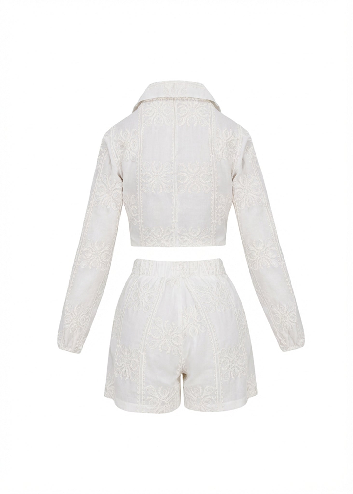 Conjunto de dos piezas compuesto por una blusa crop y un short de tiro alto, confeccionado en un tejido de base natural (posiblemente lino o ramio) con bordados suizos y perforaciones tipo broderie anglaise en disposición geométrica. La blusa presenta una estructura camisera con cuello de solapa clásico, cierre frontal mediante botonadura central y mangas largas de estilo poeta con sutil volumen en el antebrazo. El short, de silueta estructurada y corte recto, incluye una pretina ancha y plana que garantiza un ajuste limpio en la cintura, armonizando con el patrón ornamental simétrico que recorre toda la prenda.