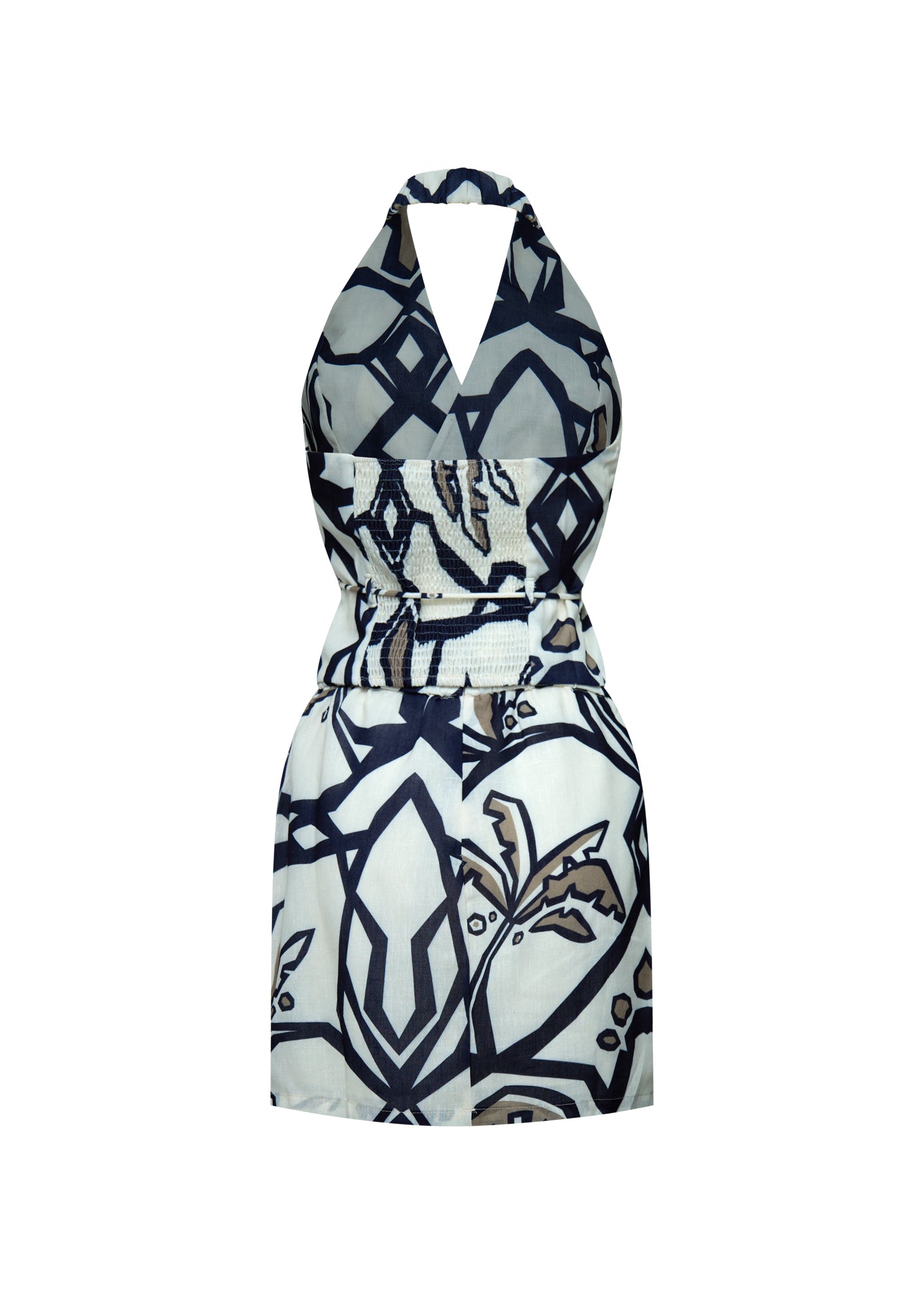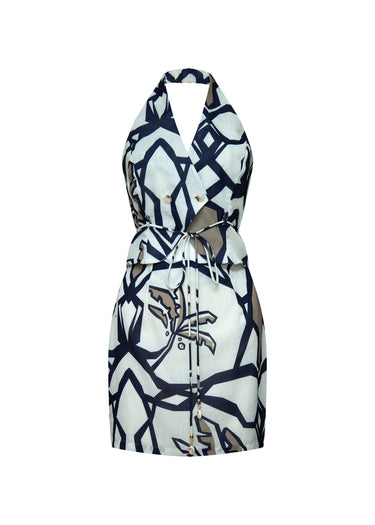 Vestido corto de silueta estructurada confeccionado en un tejido de fibra natural con estampado gráfico de gran formato en contraste. Presenta un escote halter pronunciado con solapas integradas que emulan la parte superior de un chaleco sastre, reforzado por un cierre cruzado (double-breasted) con botones nacarados. La cintura se define mediante un cordón funcional que incorpora terminales de caracoles naturales, aportando un detalle artesanal. El diseño se completa con un bajo peplum sutil que nace desde la cintura, superponiéndose a una falda de corte recto, creando un efecto de dos piezas con una construcción de alta sastrería contemporánea.