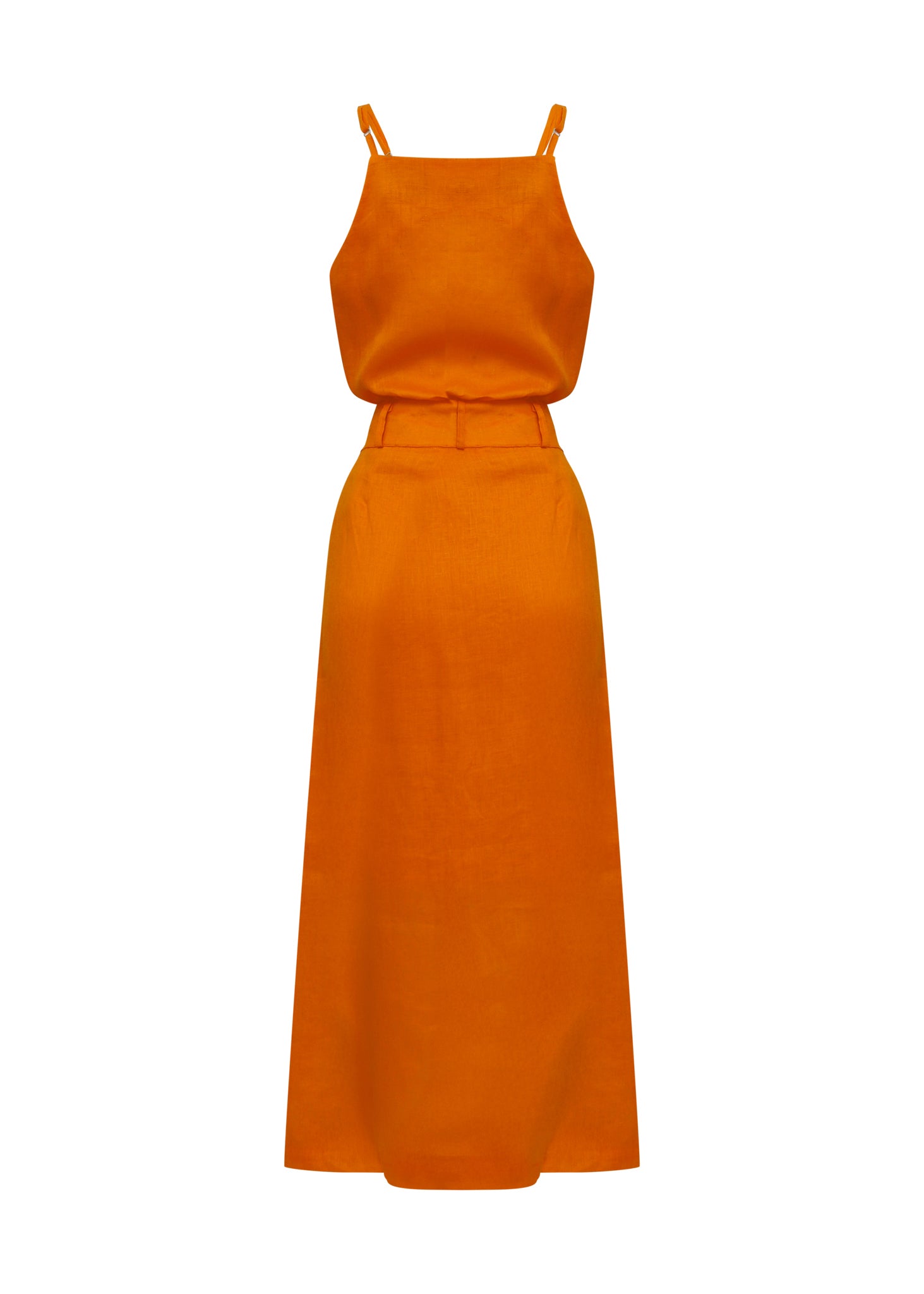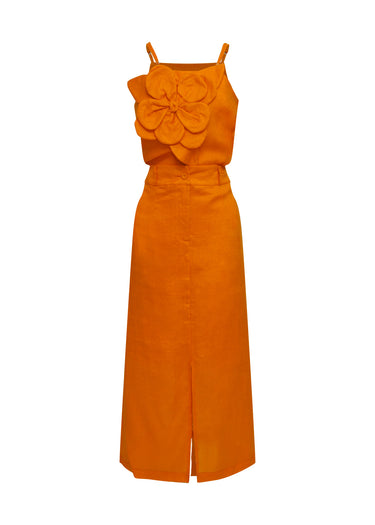 Este conjunto de dos piezas en color naranja mandarina es una declaración de estilo audaz que combina el volumen artístico con una silueta estilizada. La parte superior consiste en un top de tirantes finos ajustables que destaca por una impresionante flor tridimensional confeccionada en el mismo tejido, la cual adorna el pecho aportando relieve y un carácter escultural. Se complementa con una falda larga de tiro alto y corte recto que presenta una abertura frontal central, diseñada para aportar movimiento y un toque de sofisticación. Confeccionado en un tejido con textura natural, este set es ideal para quienes buscan un look monocromático de alto impacto para eventos exclusivos de verano.