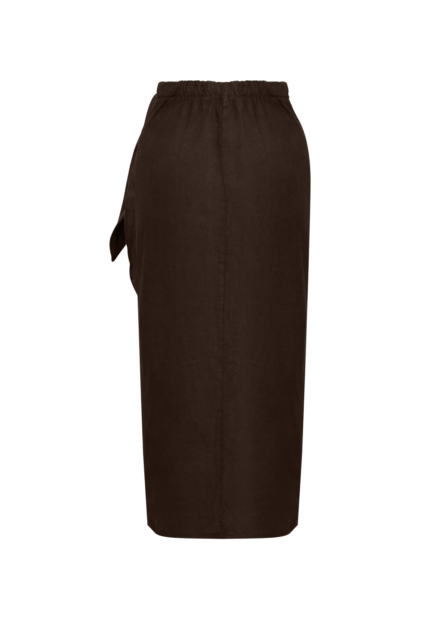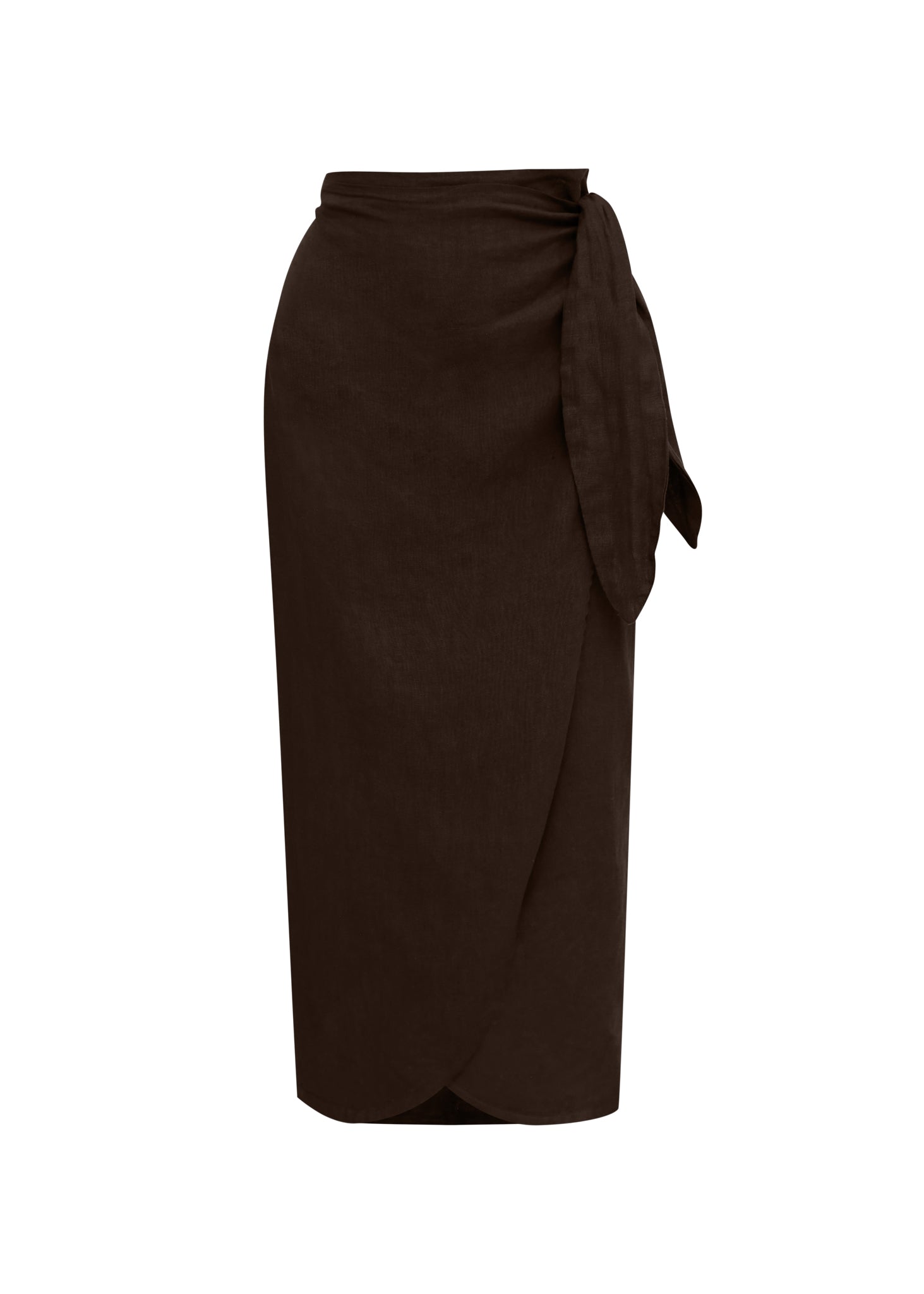 Envuelve tu estilo con nuestra Falda Midi Cruzada Estilo Pareo, una pieza esencial de resort wear en un sofisticado color marrón chocolate. Confeccionada en un tejido de lino ligero, su diseño presenta un elegante cruce frontal y un lazo lateral ajustable que no solo asegura un ajuste perfecto, sino que también crea un drapeado favorecedor. Esta falda es perfecta para transicionar de la playa a una cena elegante, aportando movimiento, comodidad y una elegancia natural a tu look.