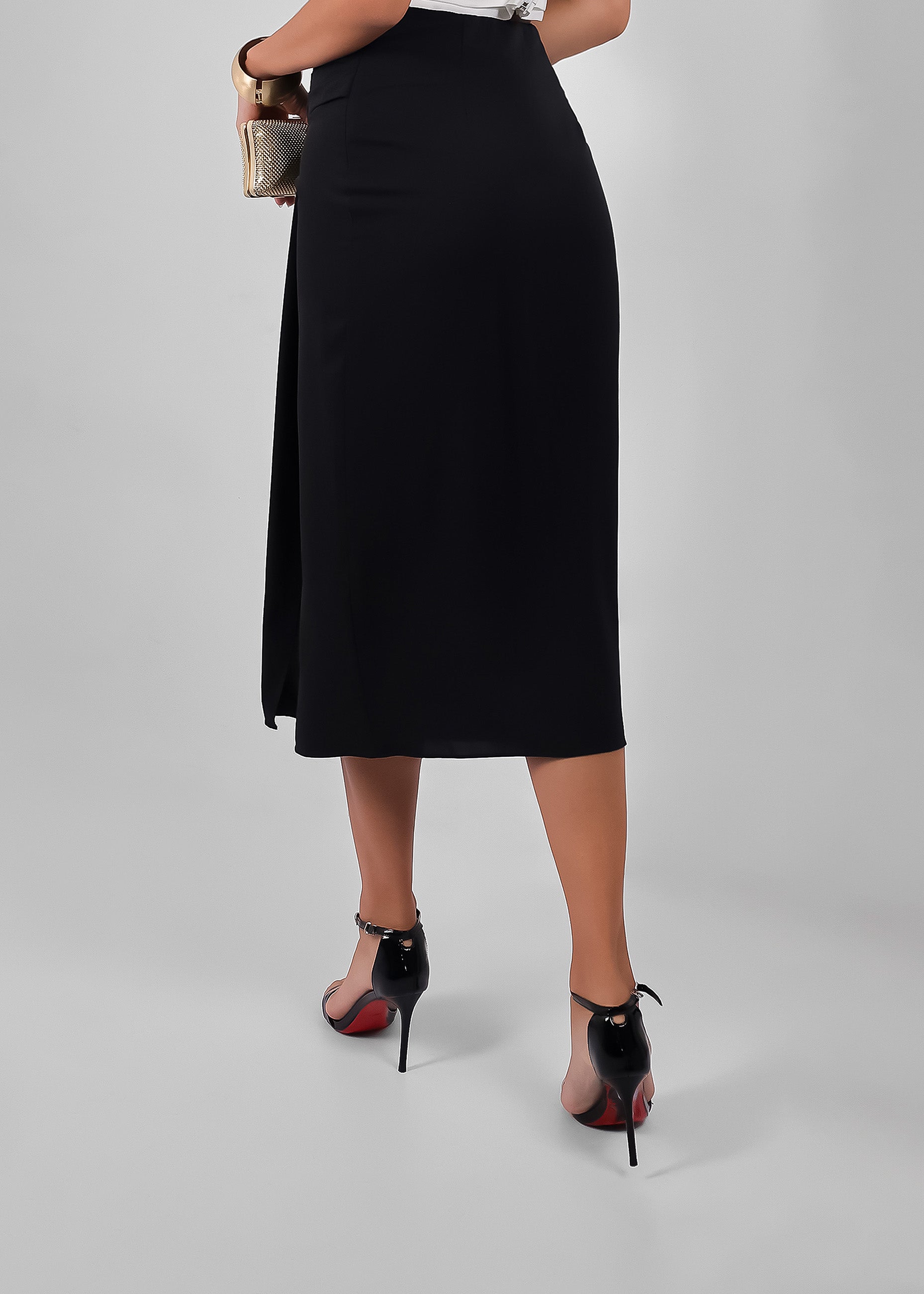 La prenda está confeccionada en un tejido fluido de color negro azabache con una caída impecable que aporta movimiento al caminar. Su diseño se caracteriza por un corte envolvente (wrap) que crea un favorecedor efecto asimétrico en el bajo, aportando verticalidad a la silueta. Presenta un tiro alto que entalla la cintura de forma limpia, convirtiéndola en la base perfecta para combinar con tops cortos o blusas por dentro. Es una pieza versátil de lujo discreto, ideal para transicionar de un look de oficina a un evento de noche con solo cambiar los accesorios.