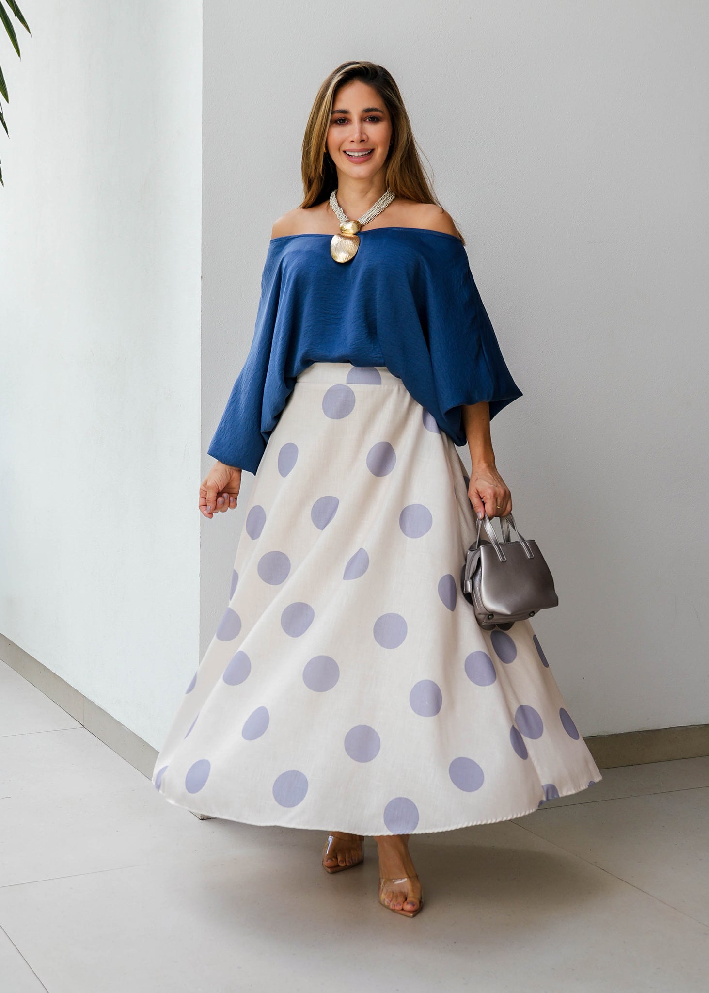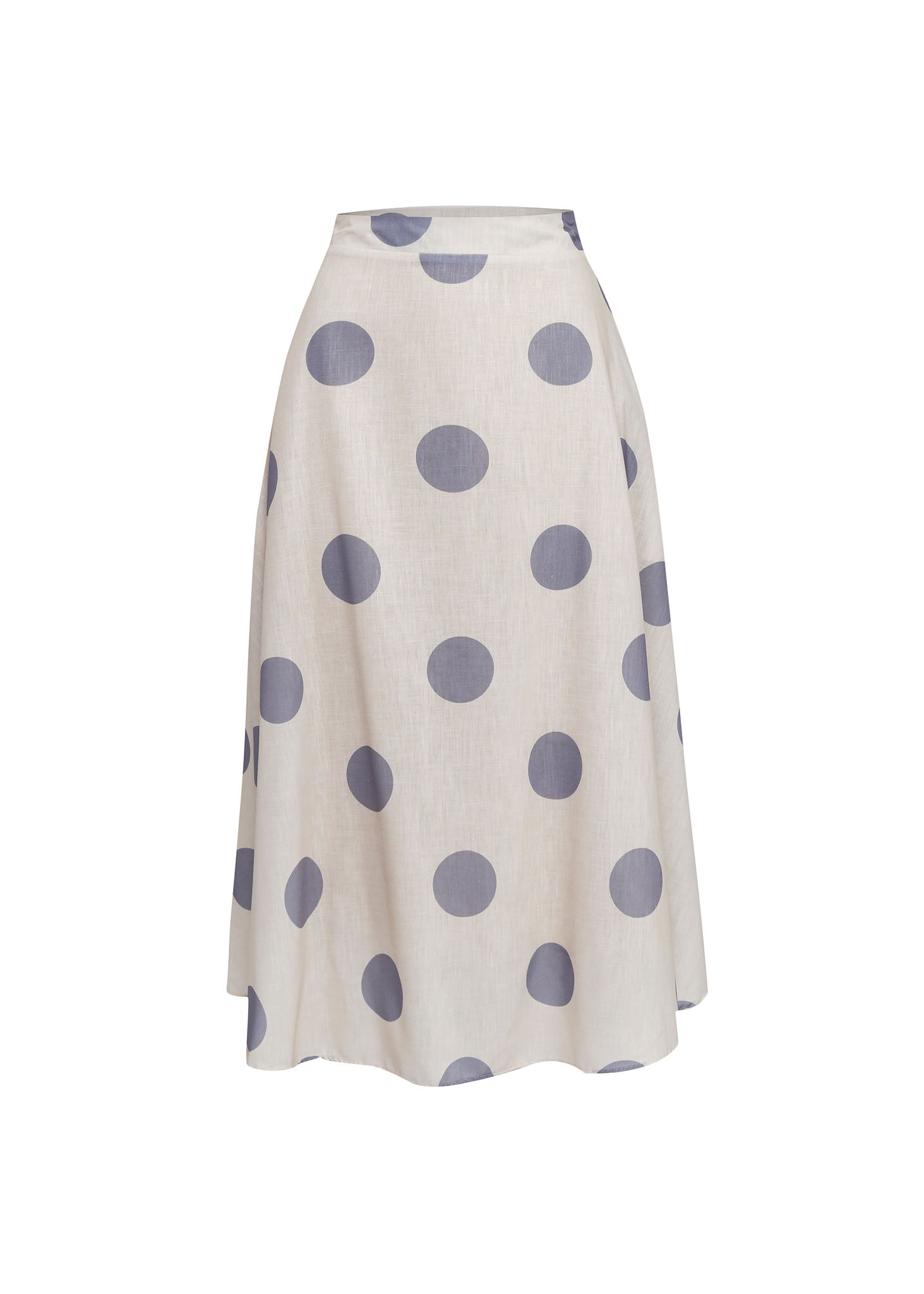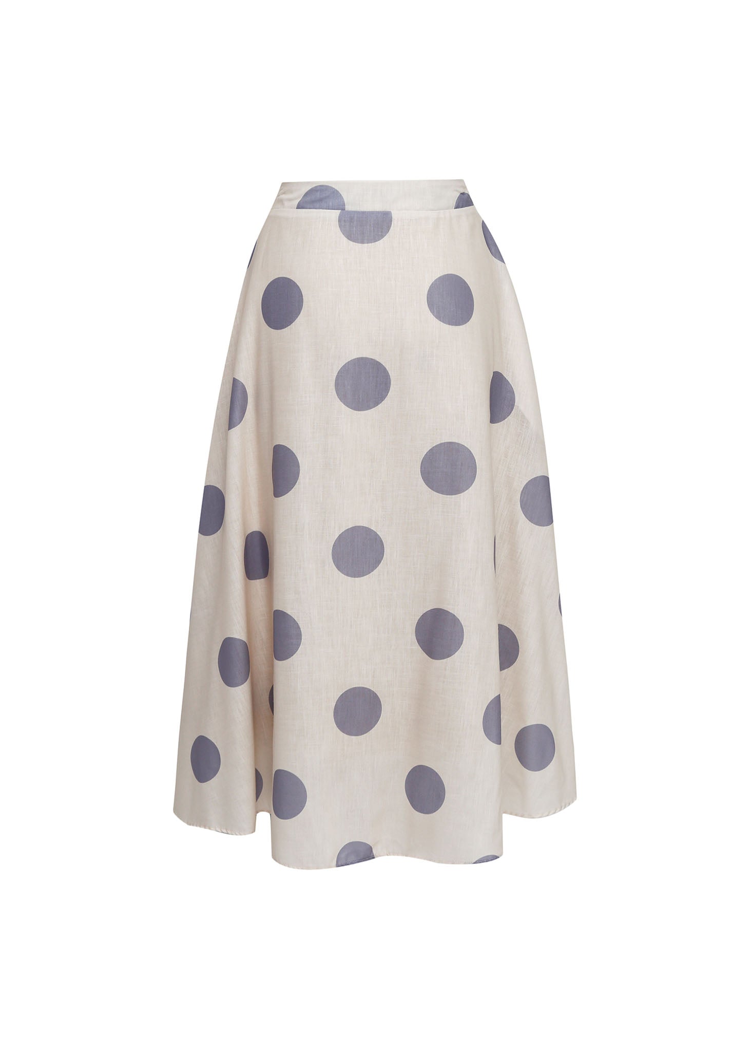 Esta falda midi de silueta evasé es una pieza de estética etérea y romántica que destaca por su riqueza visual y acabados de lujo. Confeccionada en un tejido traslúcido con cuerpo, presenta un estampado pictórico de grullas y motivos botánicos en una paleta de tonos empolvados sobre un fondo oscuro, evocando el arte tradicional asiático.