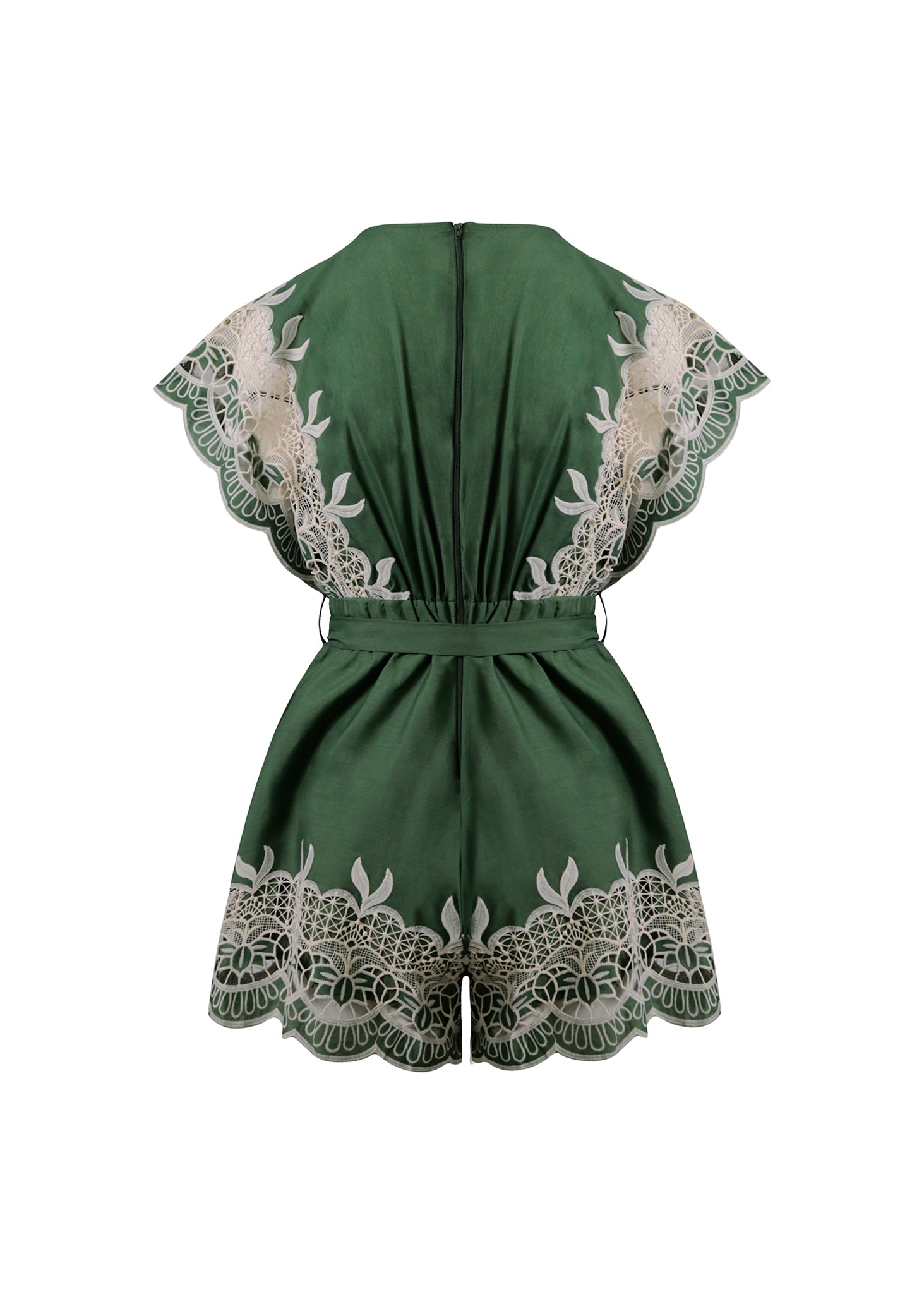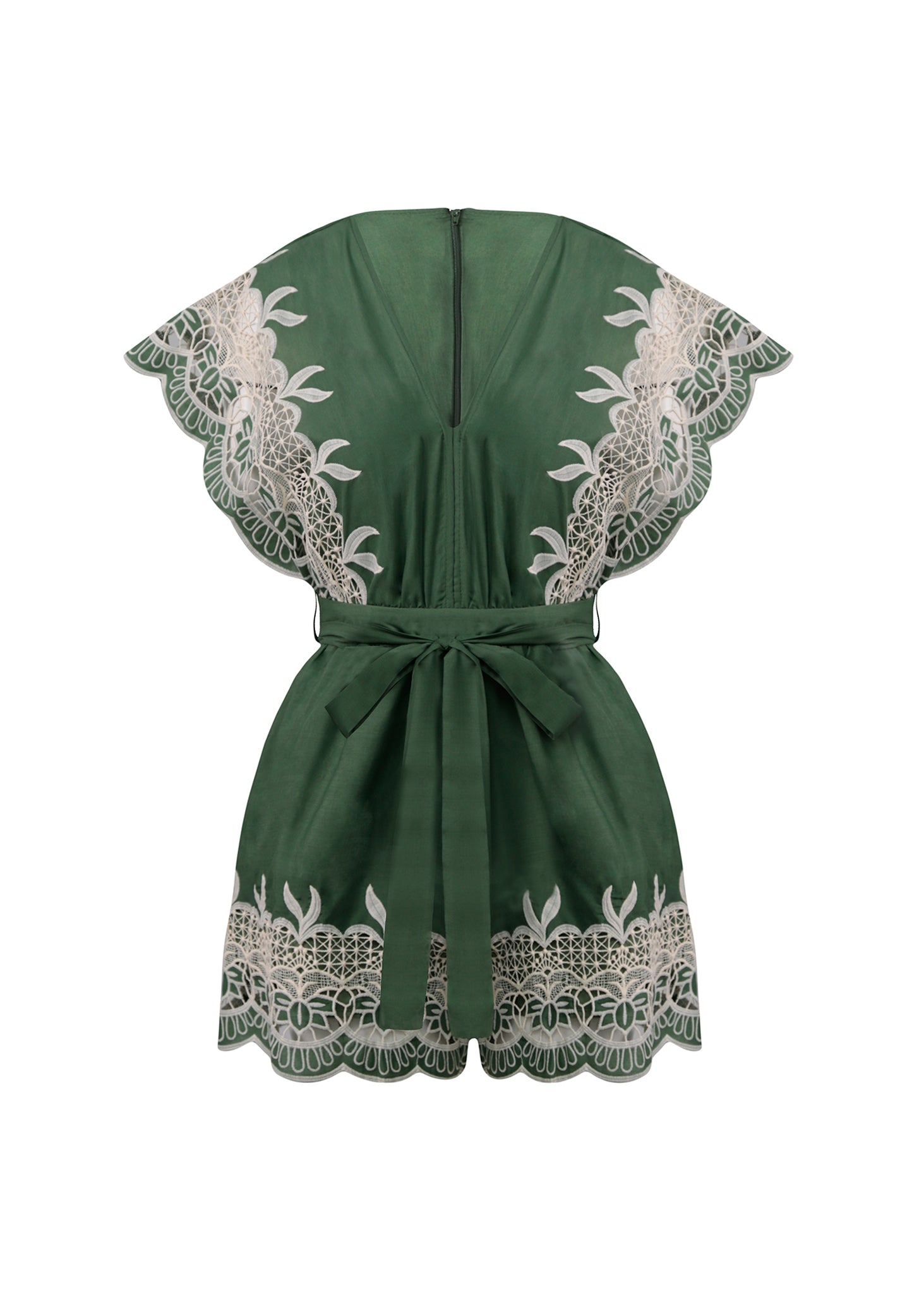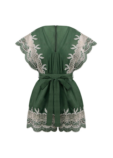 Este monoshort de seda en verde bosque es una pieza de lujo contemporáneo que destaca por su exquisito trabajo de encaje y una silueta que exuda feminidad y frescura. La prenda está confeccionada en un tejido satinado con una caída fluida, presentando un profundo escote en "V" que estiliza el torso y se equilibra con mangas cortas de corte mariposa. El diseño se distingue por sus paneles de encaje calado en color marfil, que adornan con delicadeza los bordes de las mangas y el bajo de la prenda, creando un contraste visual romántico y artesanal. Una lazada ancha en la cintura permite ajustar la prenda a la medida, definiendo la figura y convirtiéndola en una opción impecable para eventos de día o escapadas de verano con un toque de distinción.