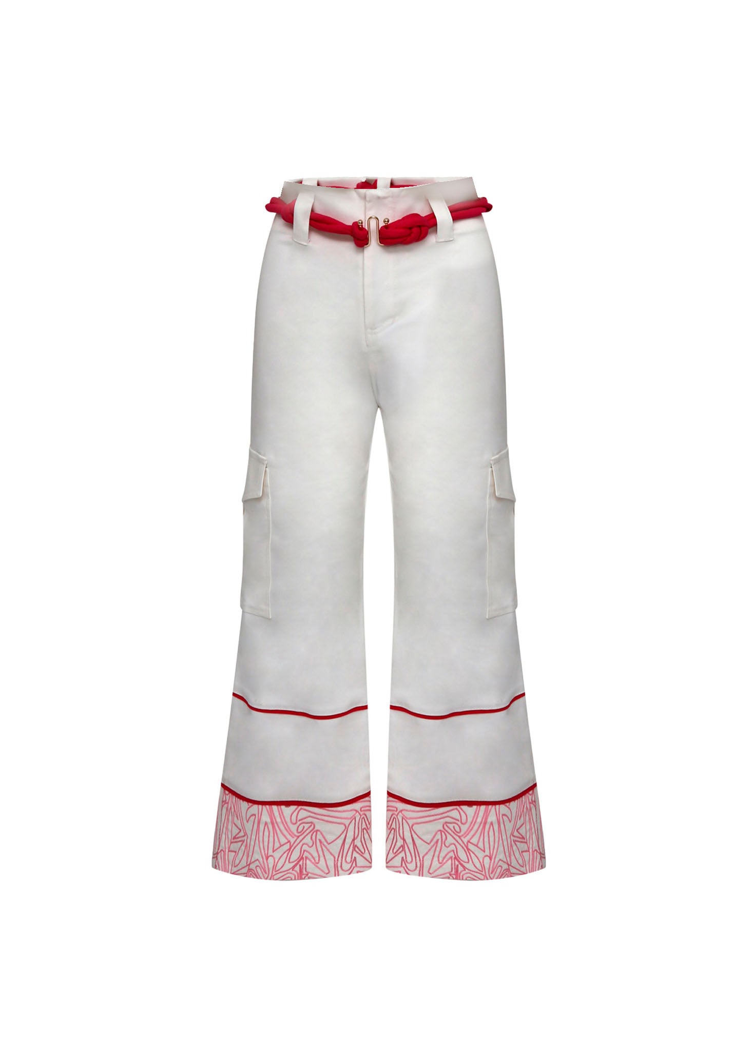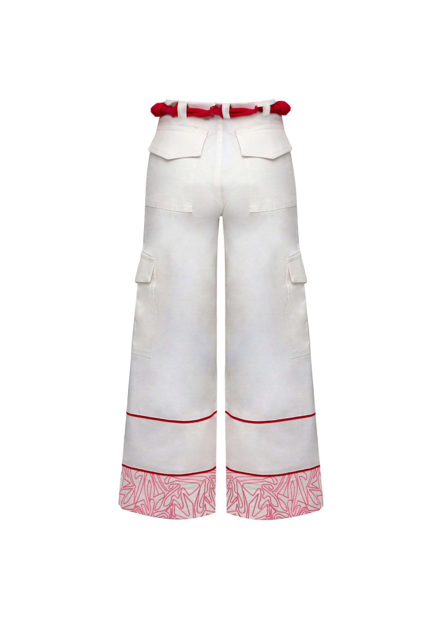 El diseño integra bolsillos laterales tipo cargo con solapas, fusionando funcionalidad con una silueta de moda actual. El detalle protagonista se encuentra en la bota, donde dos finos ribetes rojos horizontales dan paso a un bajo espectacular adornado con un bordado gráfico de líneas entrelazadas en color rosa y rojo, creando un patrón orgánico que le confiere un carácter artístico y distintivo. Es la prenda ideal para quienes buscan un equilibrio entre la estructura del diseño utilitario y la delicadeza de los detalles ornamentales.