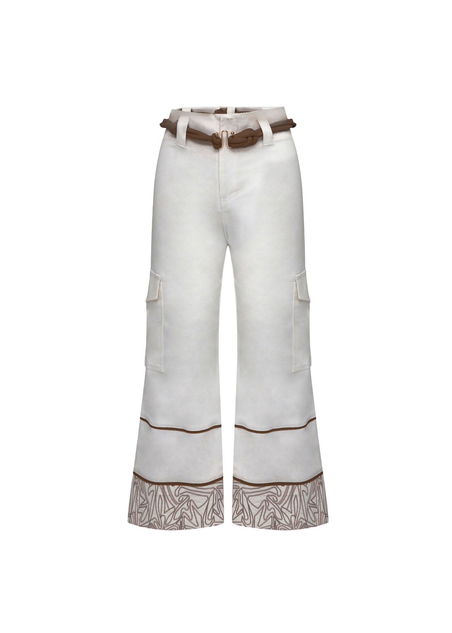 Este pantalón de bota ancha en color marfil es una pieza que eleva el estilo utilitario a una categoría de lujo artesanal. Confeccionado en un tejido firme de apariencia natural, destaca por su cinturón de cordón trenzado en color rojo vibrante, que se cierra al frente con un herraje metálico dorado, aportando un contraste náutico y sofisticado.