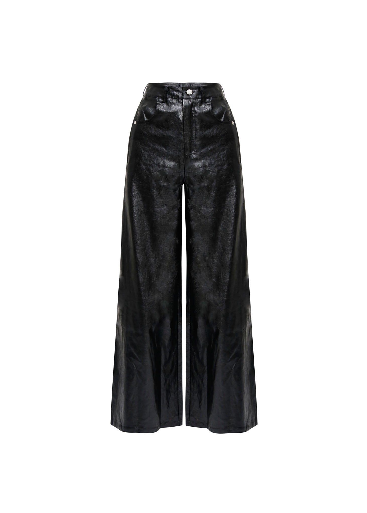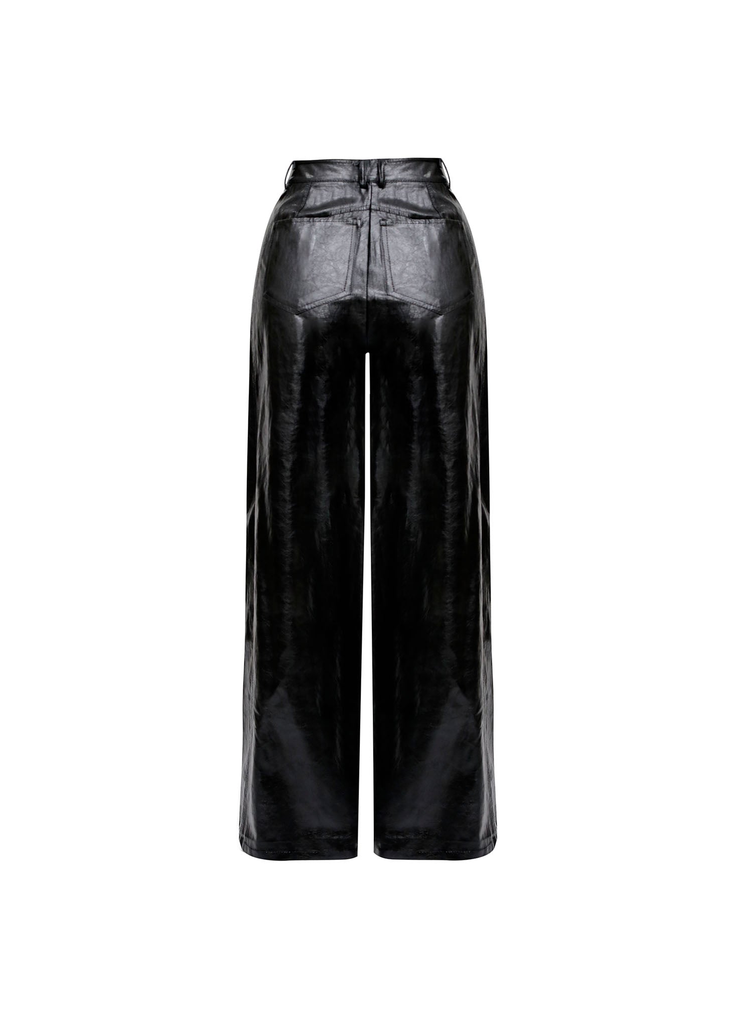 Pantalón de corte recto en negro con efecto vinilo que define la silueta con un toque moderno y sofisticado. La tela brillante aporta movimiento y presencia visual, perfecta para looks urbanos o de noche. Su línea recta alarga la figura mientras mantiene comodidad en cada movimiento. Versátil y atemporal, combina con cualquier prenda de tu guardarropa.