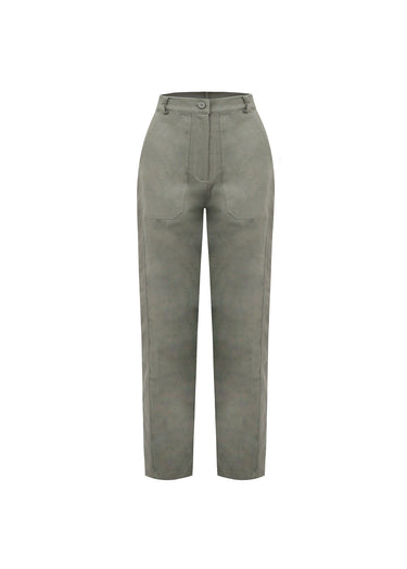 Este pantalón de estética funcional y pulida es una pieza esencial para un fondo de armario contemporáneo, combinando la resistencia del drill con una silueta de inspiración sastreada. Confeccionado en una sarga de algodón de peso medio en un sofisticado tono verde aceituna, la prenda presenta un tiro alto diseñado para definir la cintura y alargar visualmente la figura. Su sistema de cierre frontal consta de un solo botón superior y una cremallera oculta, manteniendo una línea limpia y minimalista en el talle. El diseño se completa con bolsillos laterales de corte funcional y bolsillos traseros de ojal que refuerzan su estructura, ofreciendo un equilibrio perfecto entre la comodidad utilitaria y un estilo urbano sumamente refinado.