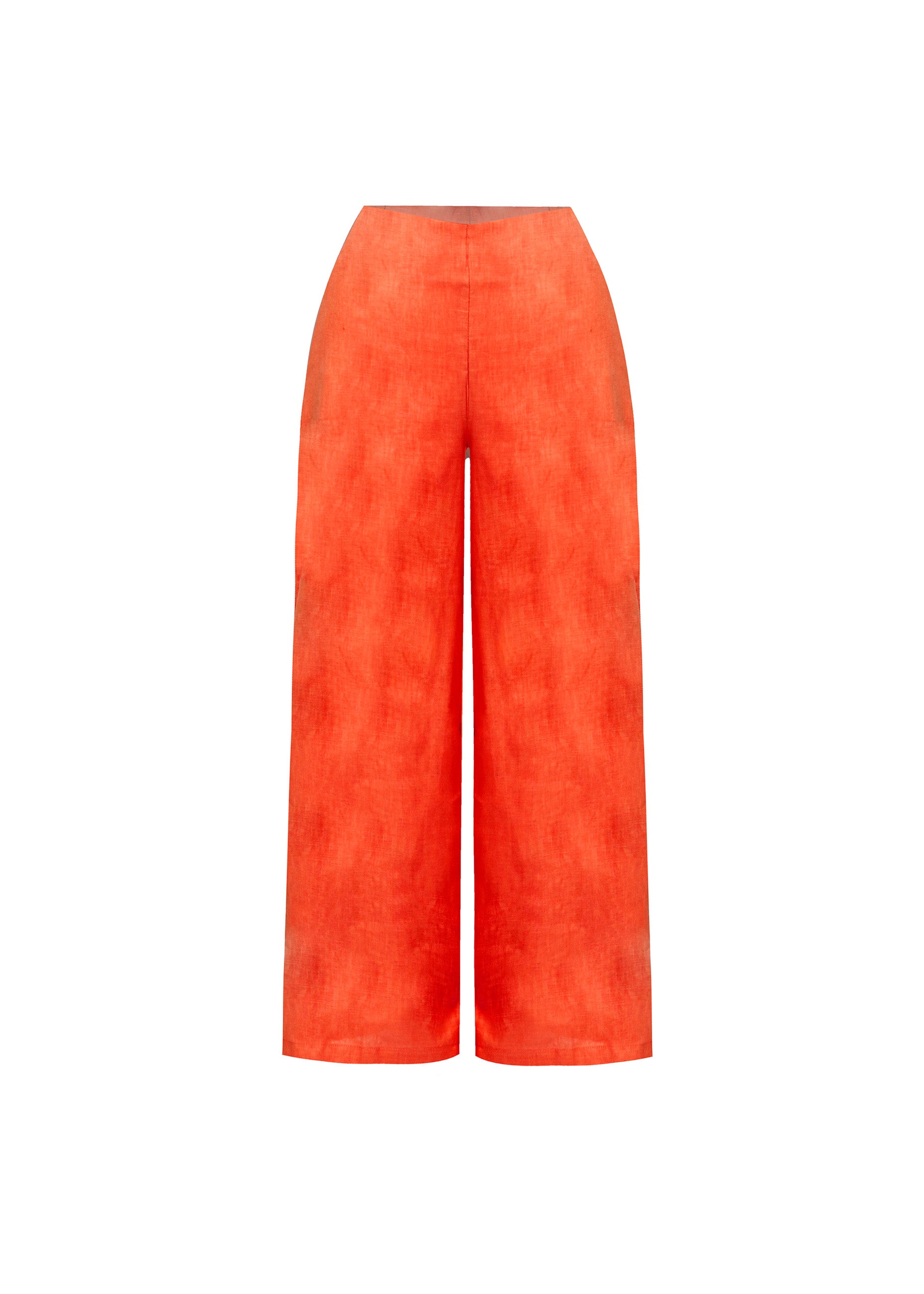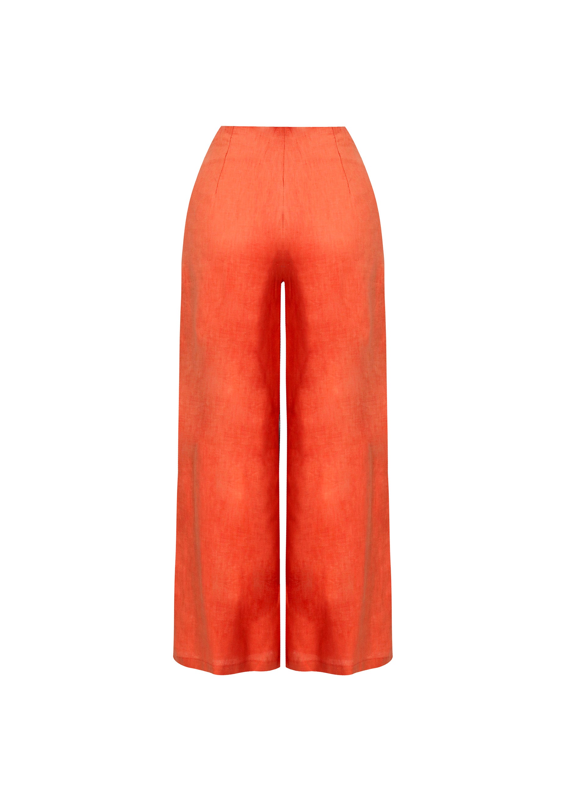 Este pantalón de pernera ancha en un vibrante color naranja teja es una pieza de diseño minimalista que destaca por su fluidez y presencia visual. La prenda presenta una cintura alta con un corte limpio y sin costuras visibles, lo que crea una silueta estilizada que se ensancha gradualmente hacia el bajo para ofrecer una caída espectacular. Confeccionado en un tejido con una textura orgánica similar al lino, su acabado jaspeado aporta profundidad al color, convirtiéndolo en una opción ideal para combinar con prendas estructuradas o crear un look monocromático lleno de carácter. Es una pieza atemporal que equilibra la comodidad de su volumen con una estética refinada y contemporánea.