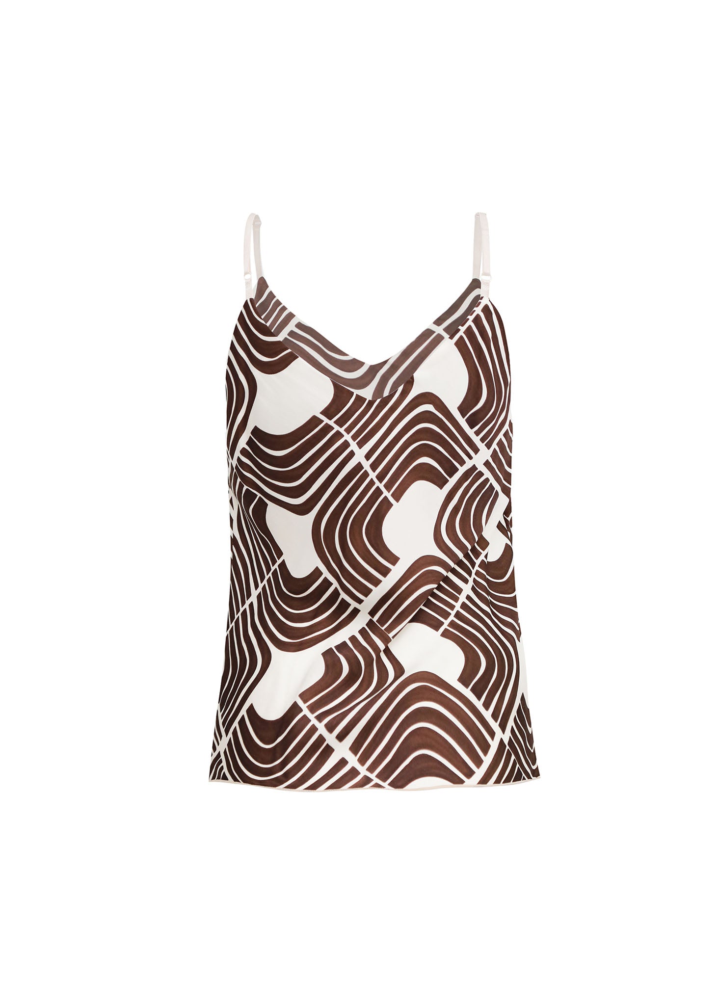 Este Top Lencero es la pieza clave para un look de impacto que evoca la moda retro de los 70. Con su vibrante estampado geométrico abstracto en tonos café intenso y blanco roto, el tejido sedoso se combina con un elegante escote cowl (drapeado). Úsalo solo o bajo un blazer para inyectar diseño y sofisticación a tu atuendo.
