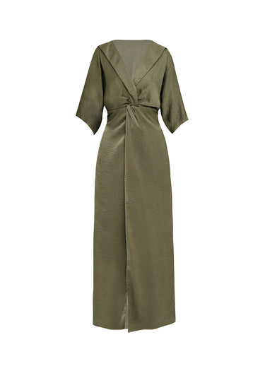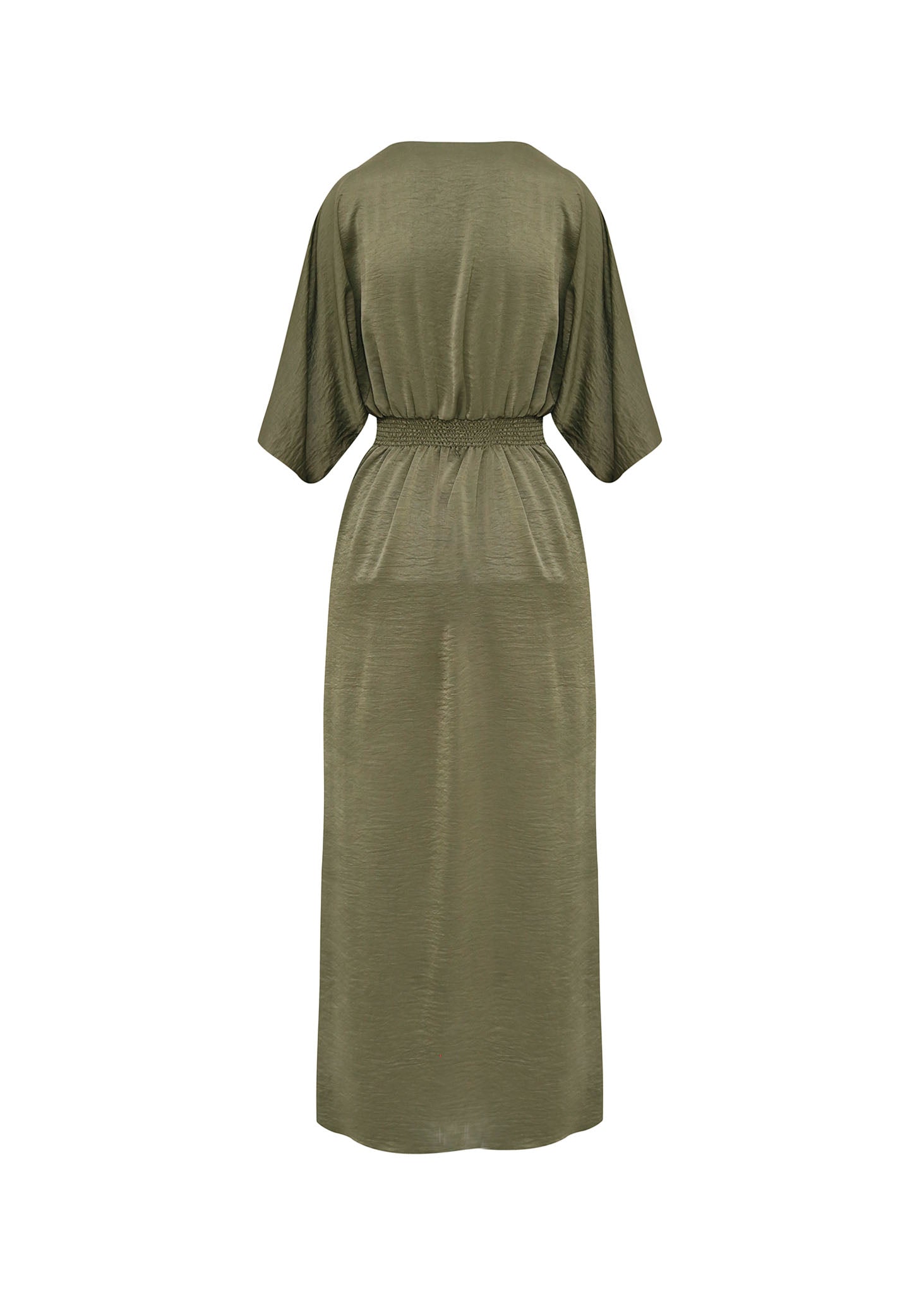 Eleva tu estilo con nuestro Vestido Midi Cruzado de Seda Estilo Caftán, una pieza de sofisticación atemporal y versatilidad inigualable. Diseñado para ofrecer una silueta favorecedora y un movimiento fluido, este vestido se convertirá en un básico imprescindible en tu armario. El lujoso tejido satinado en un profundo tono Verde captura la luz con un brillo sutil, perfecto para cualquier evento.