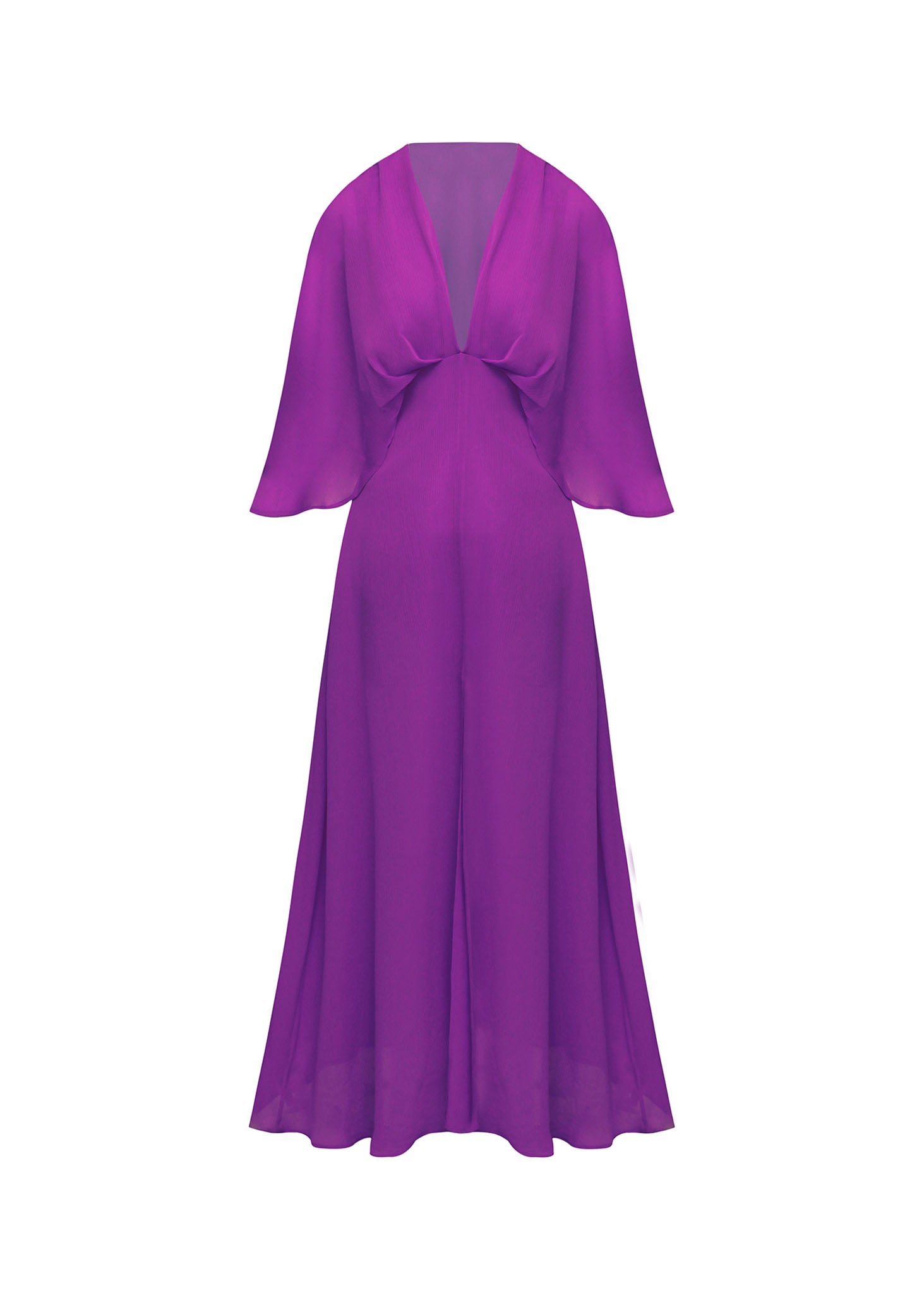 Adopta un estilo dramático y sofisticado con este deslumbrante Vestido Midi en un vibrante tono Morado Fucsia. Diseñado para destacar, presenta un elegante y profundo escote en V que se une en un detalle de fruncido o nudo en el busto, creando una silueta sumamente favorecedora. Las amplias mangas estilo kimono y la tela de chiffon con caída fluida garantizan un movimiento etéreo y comodidad absoluta, mientras que el largo midi acampanado lo hace perfecto para cualquier evento, desde bodas hasta cenas de verano, proyectando una imagen de elegancia boho-chic y audaz.