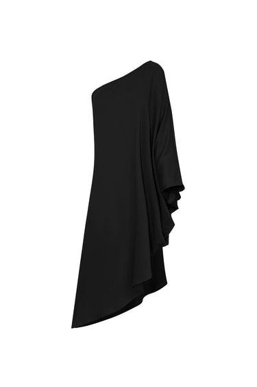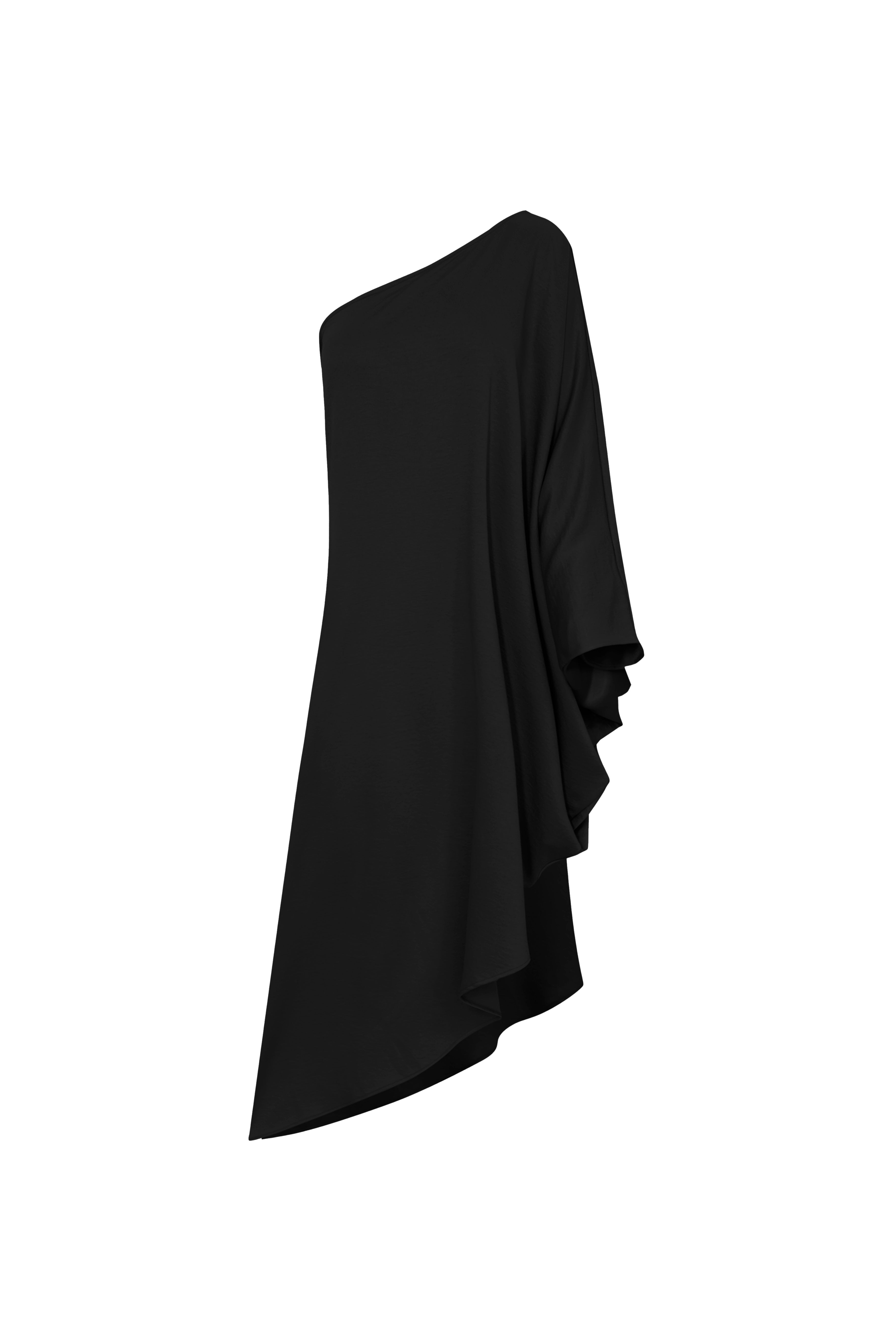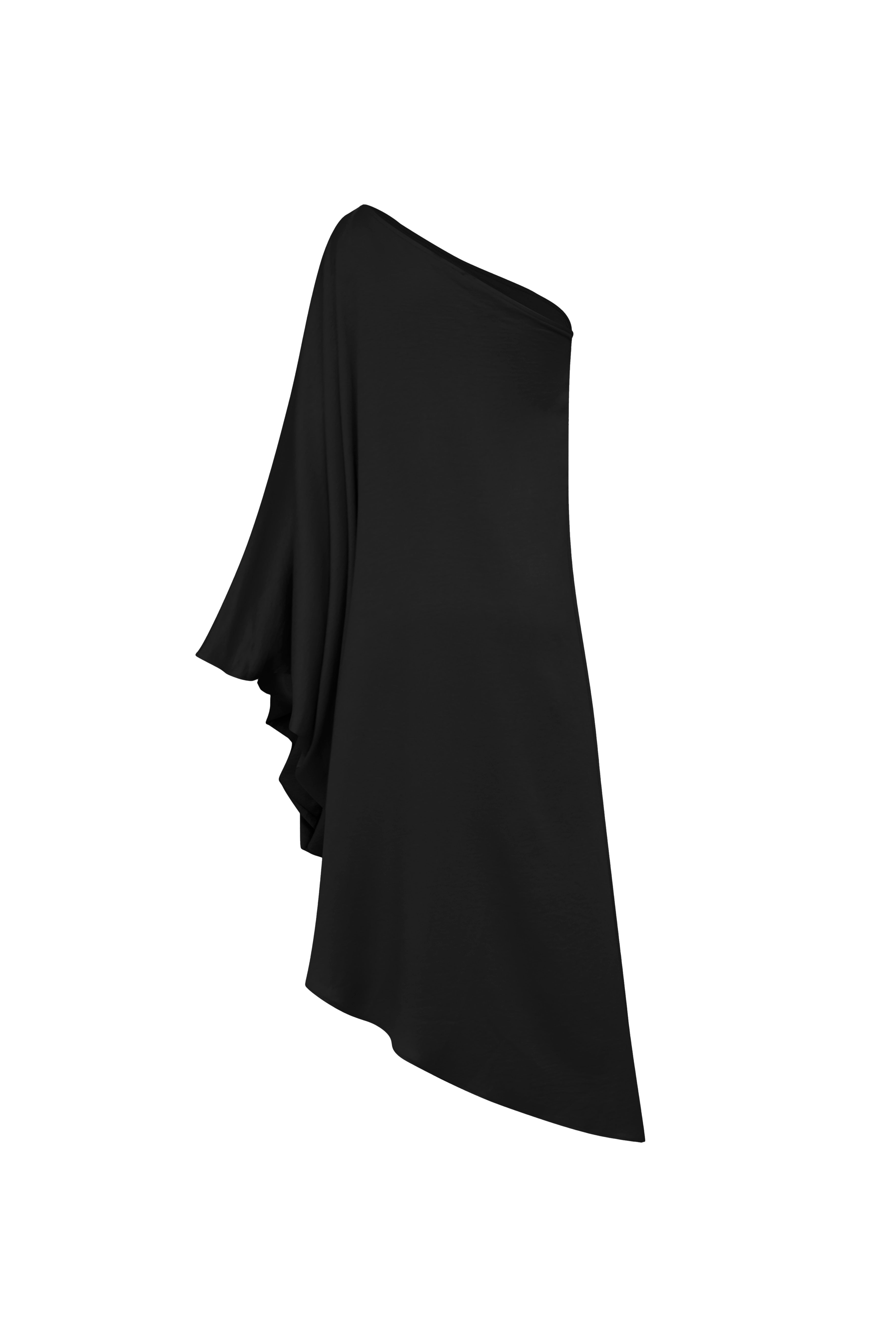 Este vestido largo de silueta minimalista es una pieza de diseño arquitectónico que destaca por su drapeado fluido y su elegancia atemporal. La prenda presenta un sofisticado escote asimétrico de un solo hombro, que se extiende hacia una estructura de corte oversize con una caída excepcional que envuelve el cuerpo de forma etérea. Caracterizado por su volumen lateral y un bajo asimétrico que aporta un movimiento escultural al caminar, este vestido monocromático en negro absoluto redefine el lujo contemporáneo a través de la simplicidad y la pureza de sus líneas.