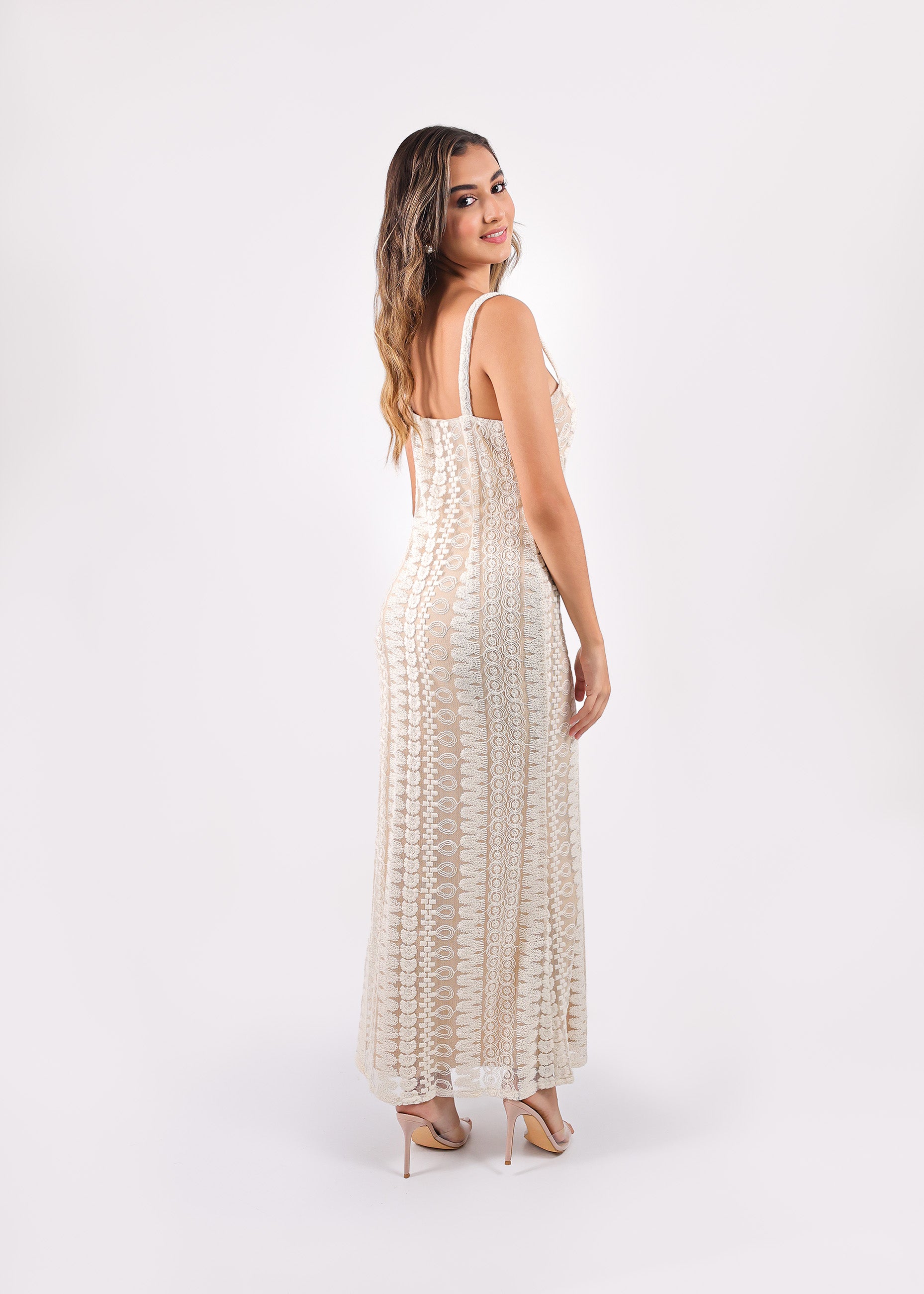 La prenda está confeccionada en un exquisito encaje de guipur con un intrincado patrón geométrico y lineal que recorre toda la silueta de forma vertical. Presenta un cuerpo entallado con escote corazón sutil y tirantes anchos texturizados que enmarcan los hombros con elegancia. El diseño se superpone a un forro en tono nude o champán, lo que permite que el complejo calado del encaje resalte con nitidez, creando un efecto visual de profundidad. La falda cae de forma fluida hasta el suelo, manteniendo una línea depurada que alarga la figura, convirtiéndolo en la elección perfecta para eventos de etiqueta o celebraciones nocturnas de alto nivel.