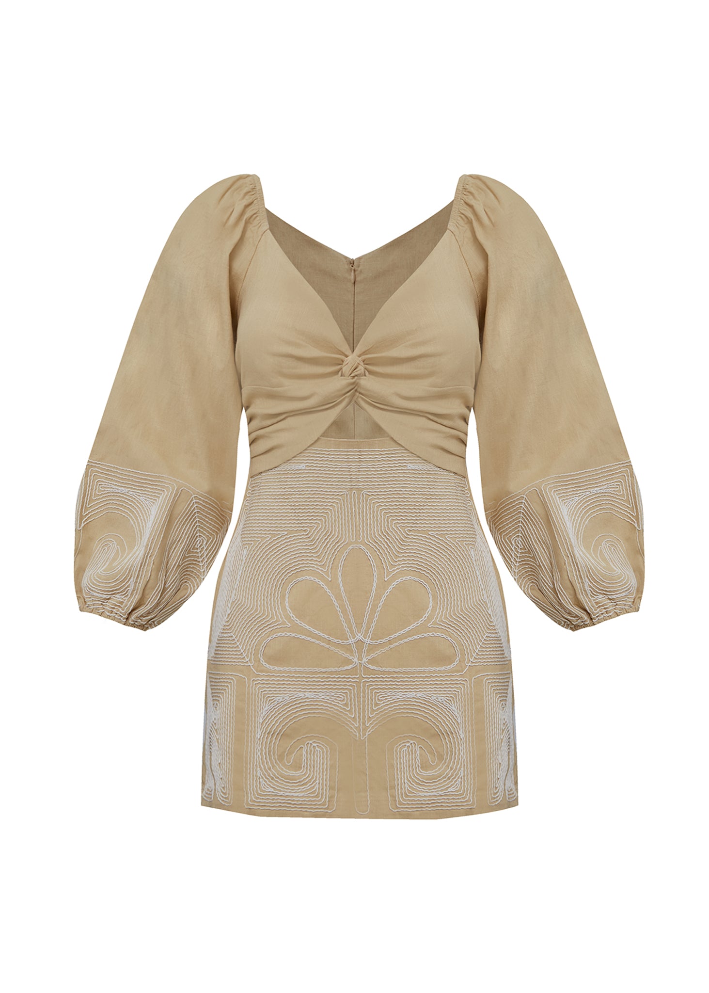 Este Minivestido es una pieza de diseño que combina romanticismo y audacia. Confeccionado en un versátil tono beige o arena, presenta una silueta favorecedora con un cuerpo crop cruzado y un sensual escote en V que incluye un sutil cut-out en la cintura. Destaca por sus dramáticas mangas abullonadas a la altura del codo y una falda mini adornada con un intrincado y llamativo bordado geométrico en contraste, ideal para cenas, fiestas o un estilo resort sofisticado.