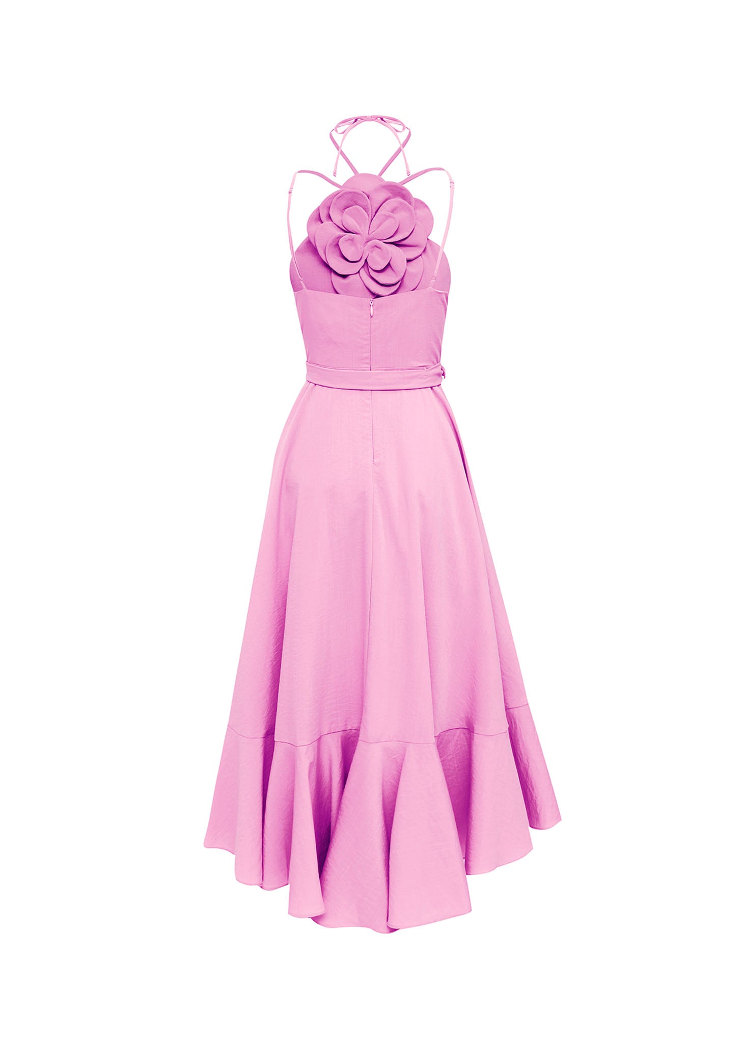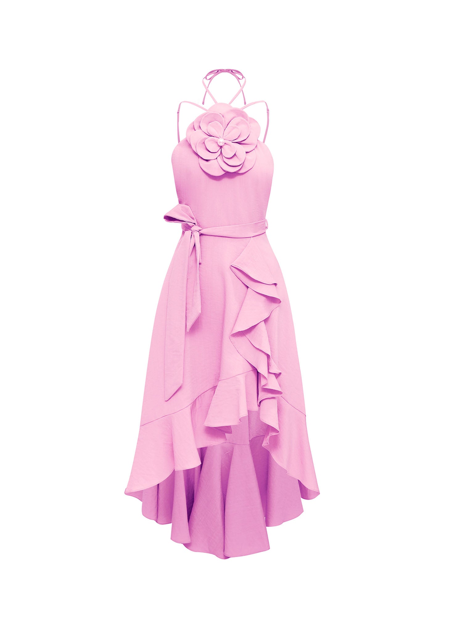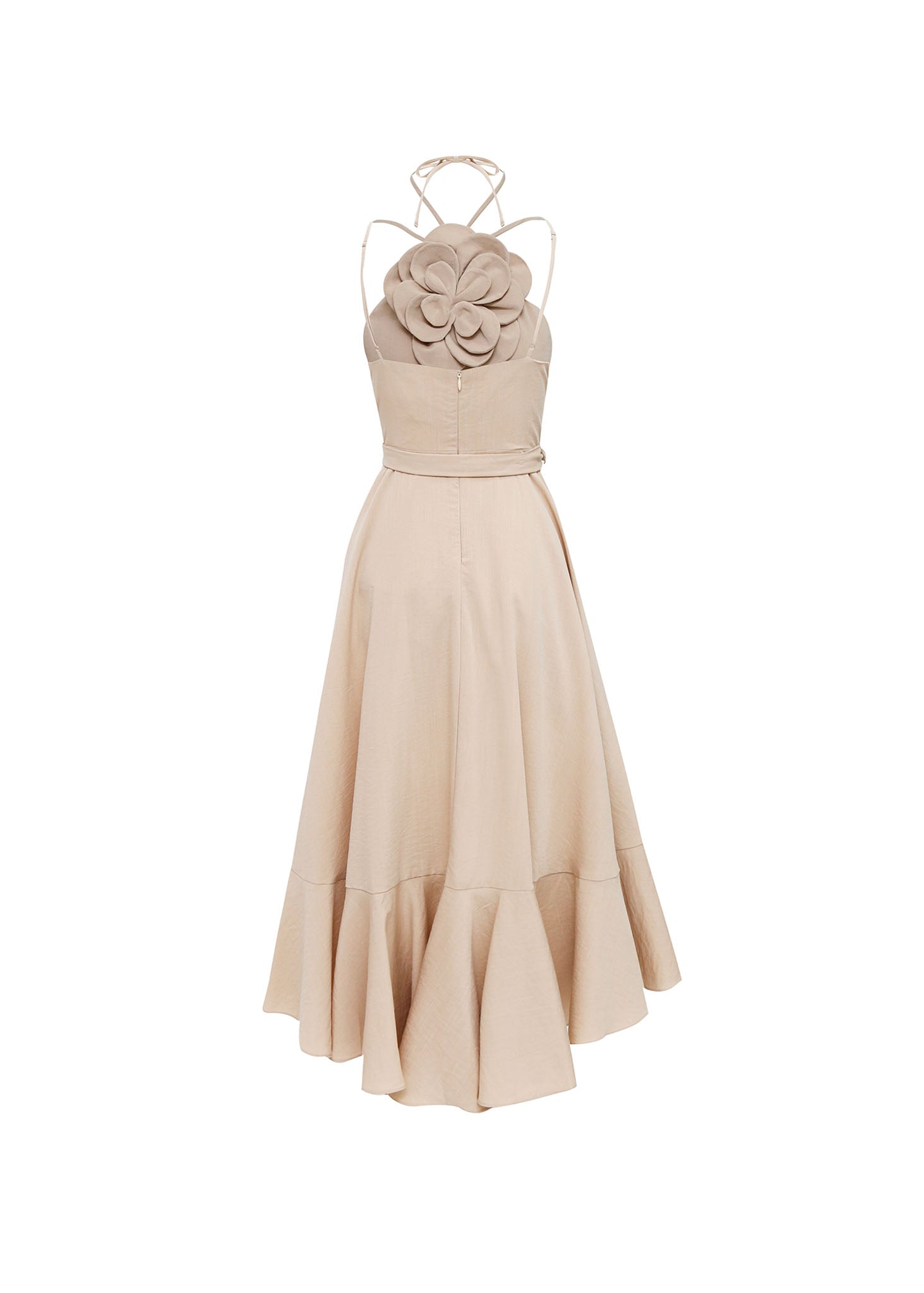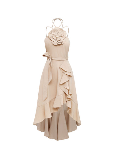 El Vestido 'Flor Silvestre' es la máxima expresión de romanticismo chic, ideal para eventos de día o atardecer. Confeccionado en un lujoso tejido con tacto de lino en un versátil tono nude pálido, este statement piece destaca por su aplicación floral 3D cosida en el busto, aportando un volumen escultórico único. Su escote halter con tirantes cruzados ofrece un soporte elegante, mientras que la falda de silueta high-low