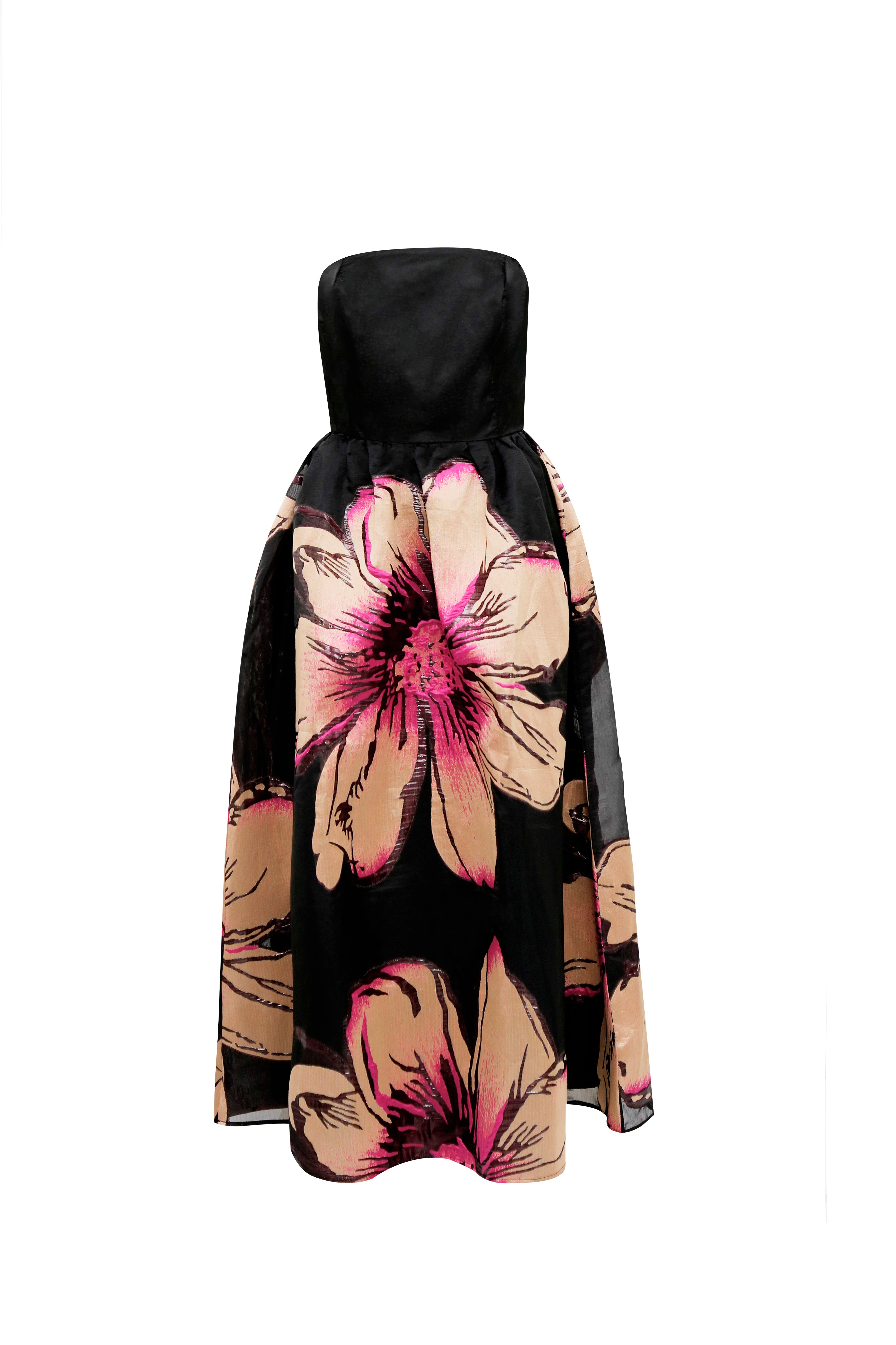 Vestido de gala strapless es una declaración de estilo audaz y refinado. El diseño presenta un corpiño estructurado en color negro azabache con un escote recto que estiliza los hombros y el cuello. La transición hacia la falda revela un volumen majestuoso de estilo línea A, confeccionado en un tejido con cuerpo y brillo sutil. El protagonista indiscutible es su estampado floral de gran escala en tonos crema y fucsia vibrante, que parece cobrar vida sobre el fondo oscuro.