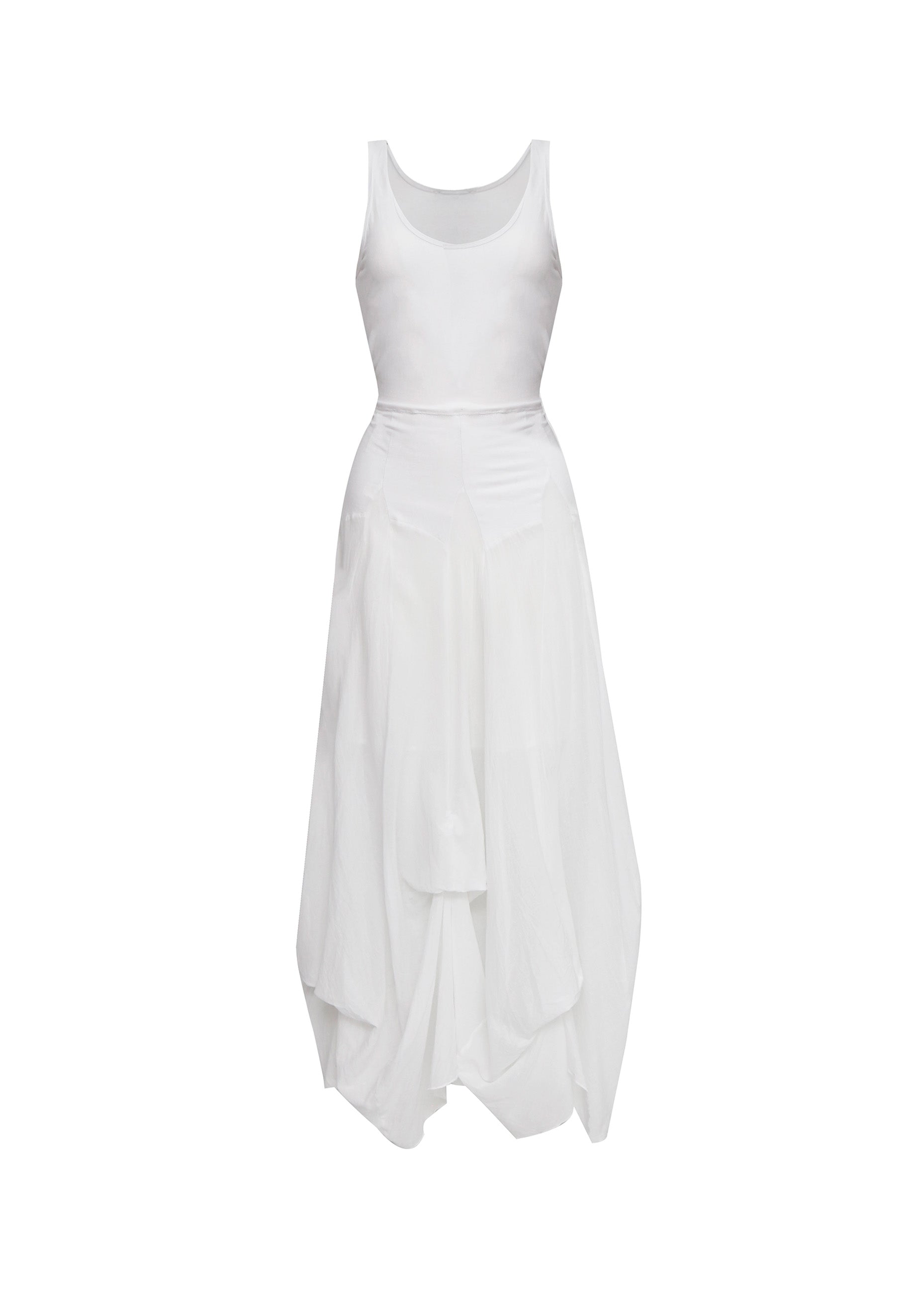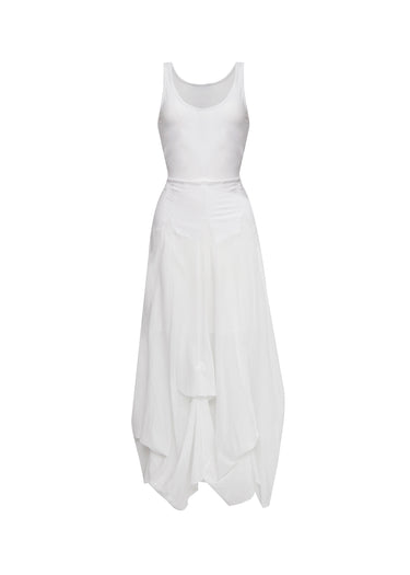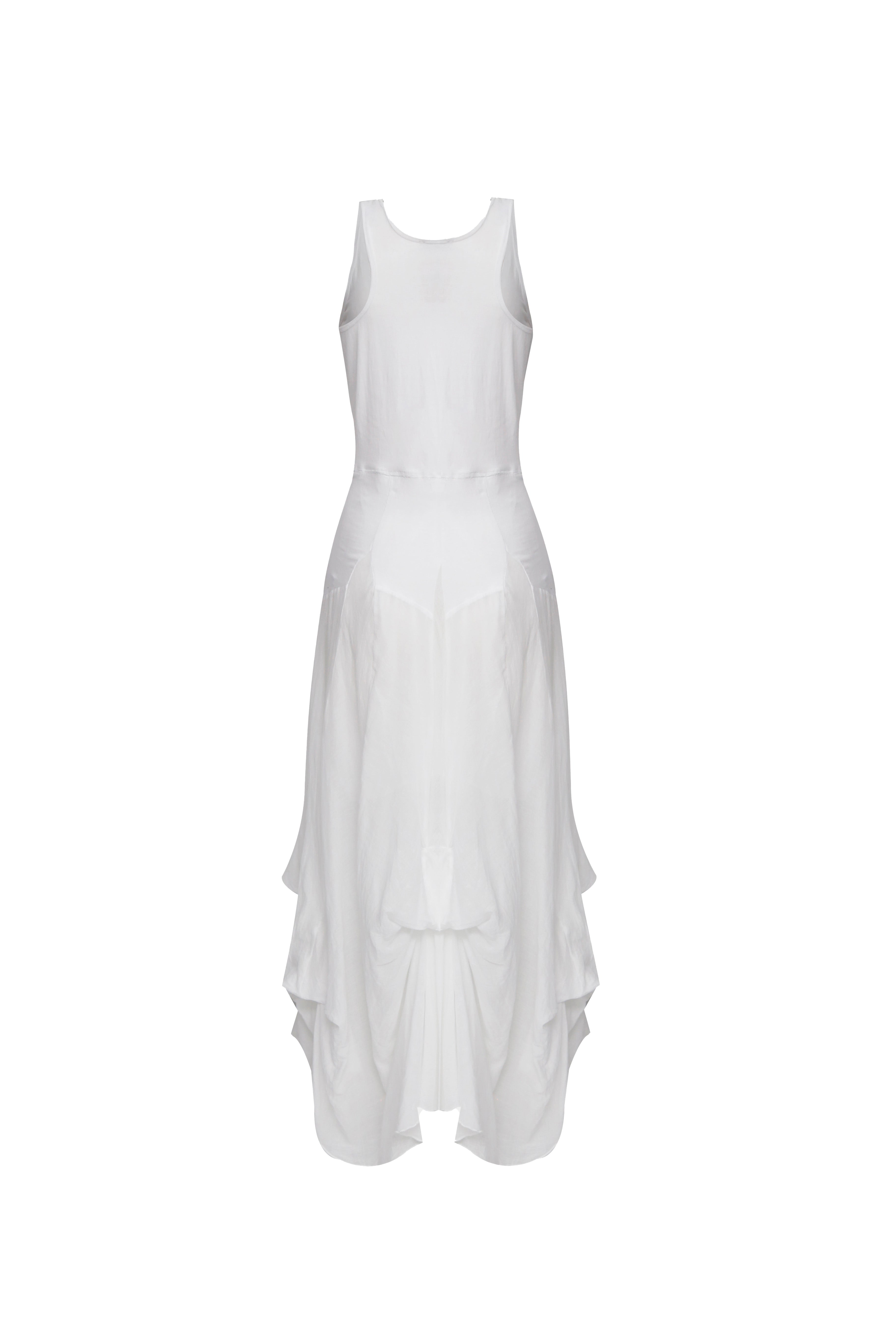 Este vestido largo en color blanco puro es una pieza que destaca por su diseño fluido y su estructura de capas etéreas. La prenda se compone de un cuerpo estilo camiseta sin mangas, con un escote redondo clásico y tirantes anchos que aportan un aire minimalista y deportivo. Su elemento más distintivo es la falda de gran volumen, construida mediante la superposición de paneles de tejido asimétricos que crean un bajo irregular y dinámico. Confeccionado en un material ligero con un sutil acabado translúcido en la parte inferior, este vestido evoca una estética bohemia y contemporánea, ideal para quienes buscan una prenda con movimiento y una silueta escultural.